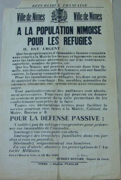 Nîmes, imprimerie Pujolas, 1940. Affiche 70 x 40 cm sur papier jaune. Manque de papier dans l'angle supérieur gauche de l'affiche. Trois autres déchirures sans manque. Accueil des réfugiés de l'exode. Recommandation pour la défense passive, demande pour les logements vacants et matériel de couchage.