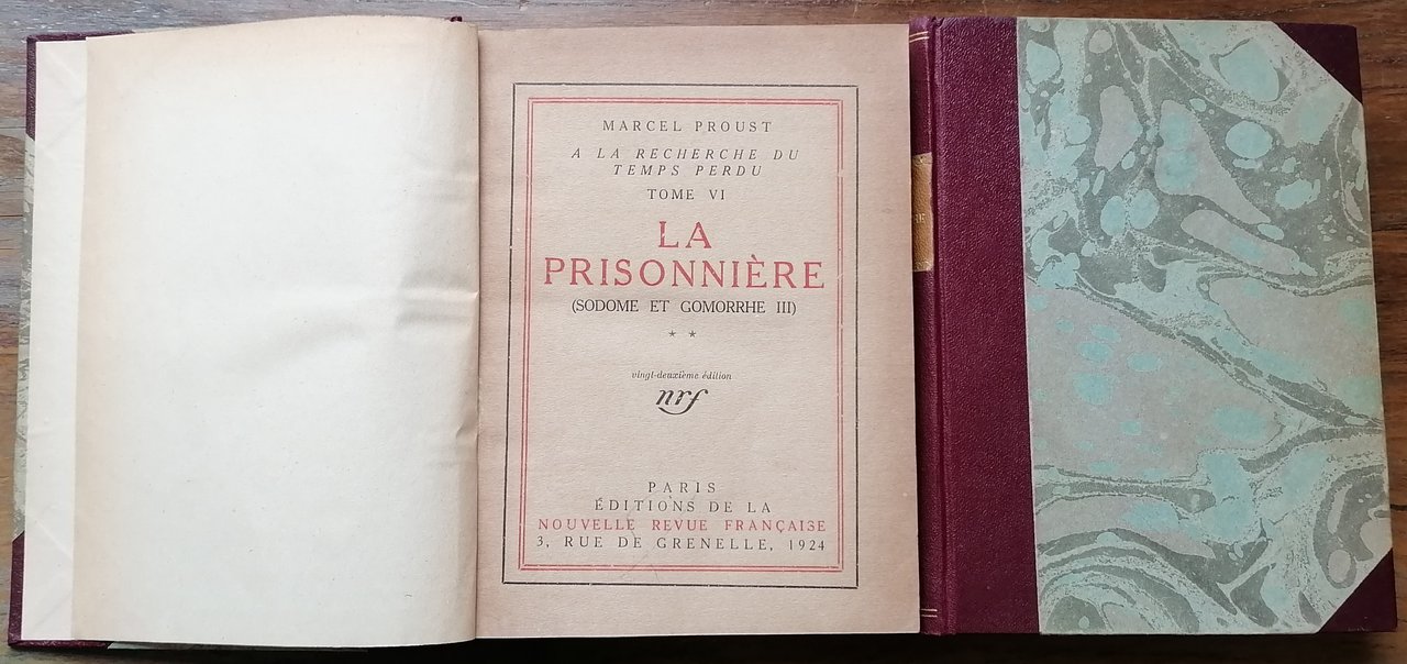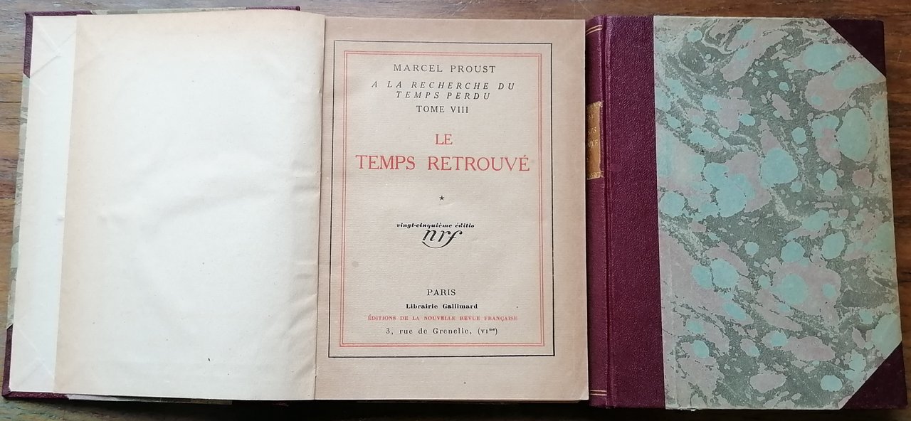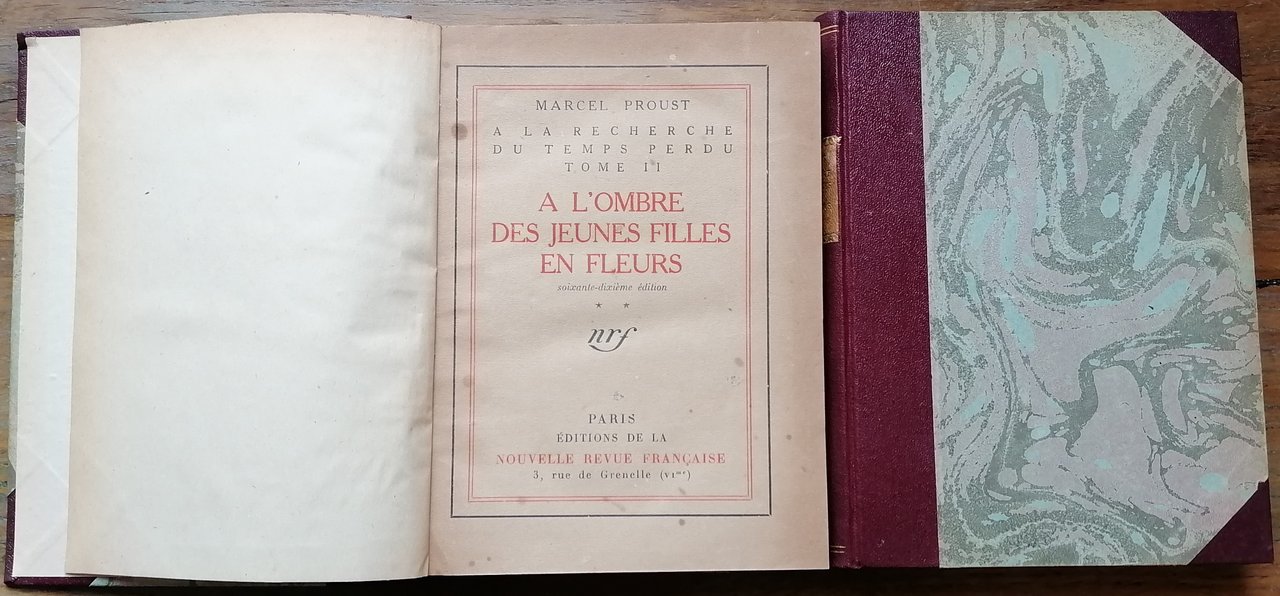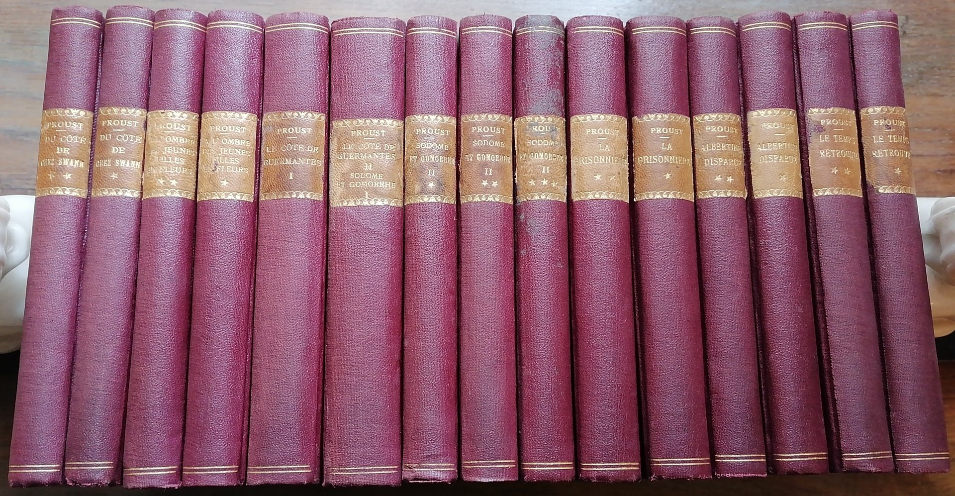 Editions de la Nouvelle Revue Français. Quindici volumi (cm 18 x 13,5), legature coeve in mezza tela con punte, carta marmorizzata ai piatti, conservate le copertine delle brossure originali. "Du coté de chez Swann" (1924, due volumi, pp. 203 ; 190). "A l'ombre des jeunes filles en fleurs" (1924, due volumi, pp. 250 ; 232). "Le coté de Guermantes" + "Sodome et Gomorrhe I" (1920-1923, due volumi, pp. 280 ; 282). "Sodome et Gomorrhe II" (1924, tre volumi, pp. 232 ; 238 ; 240). "La prisonnière" (1923-1924, due volumi, pp. 282 ; 290). "Albertine disparue" (1925, due volumi, pp. 228 ; 216). "Le temps retrouvé" (1927, due volumi, pp. 240 ; 262). Volumi in ottimo stato di conservazione con lieve e naturale ingiallimento della carta.
