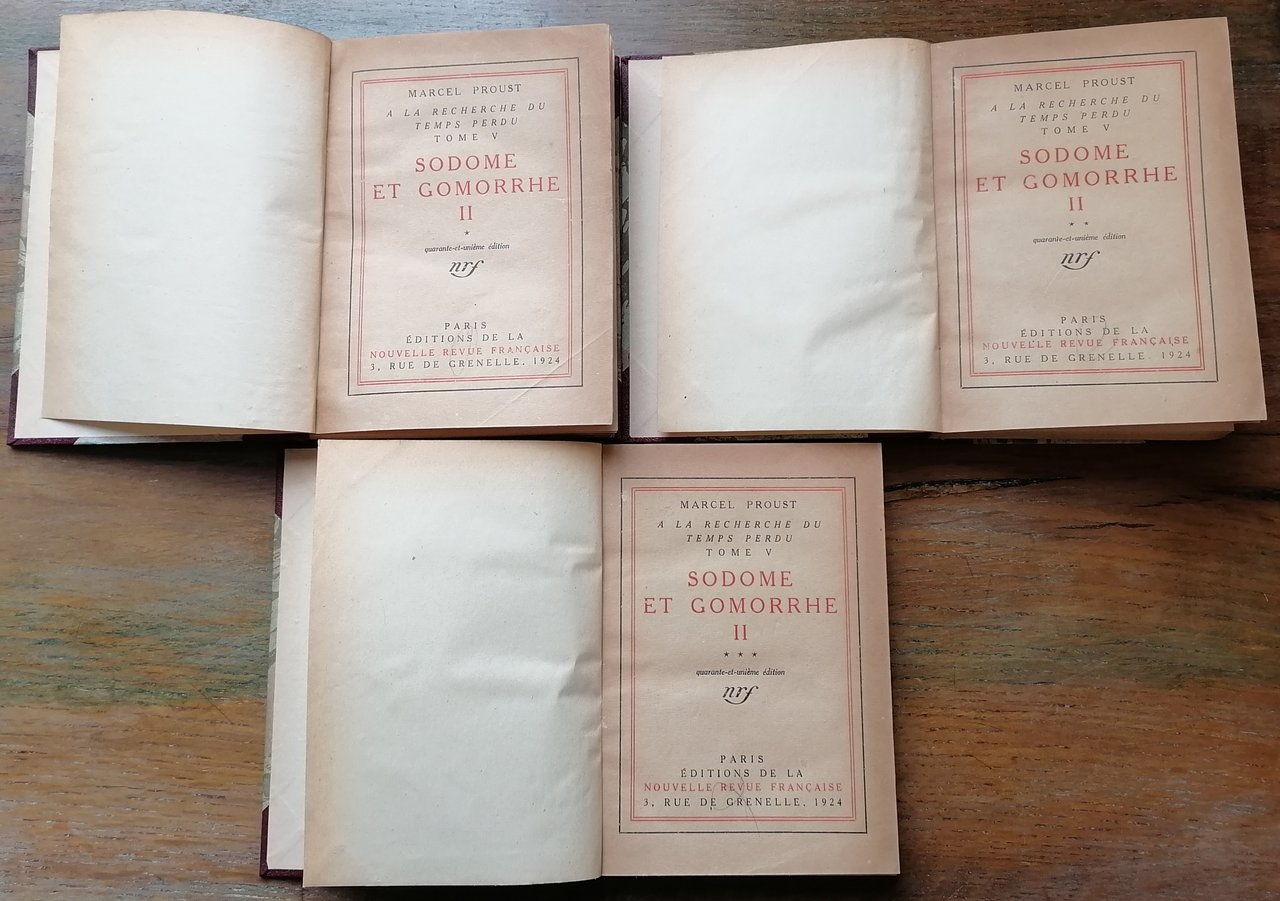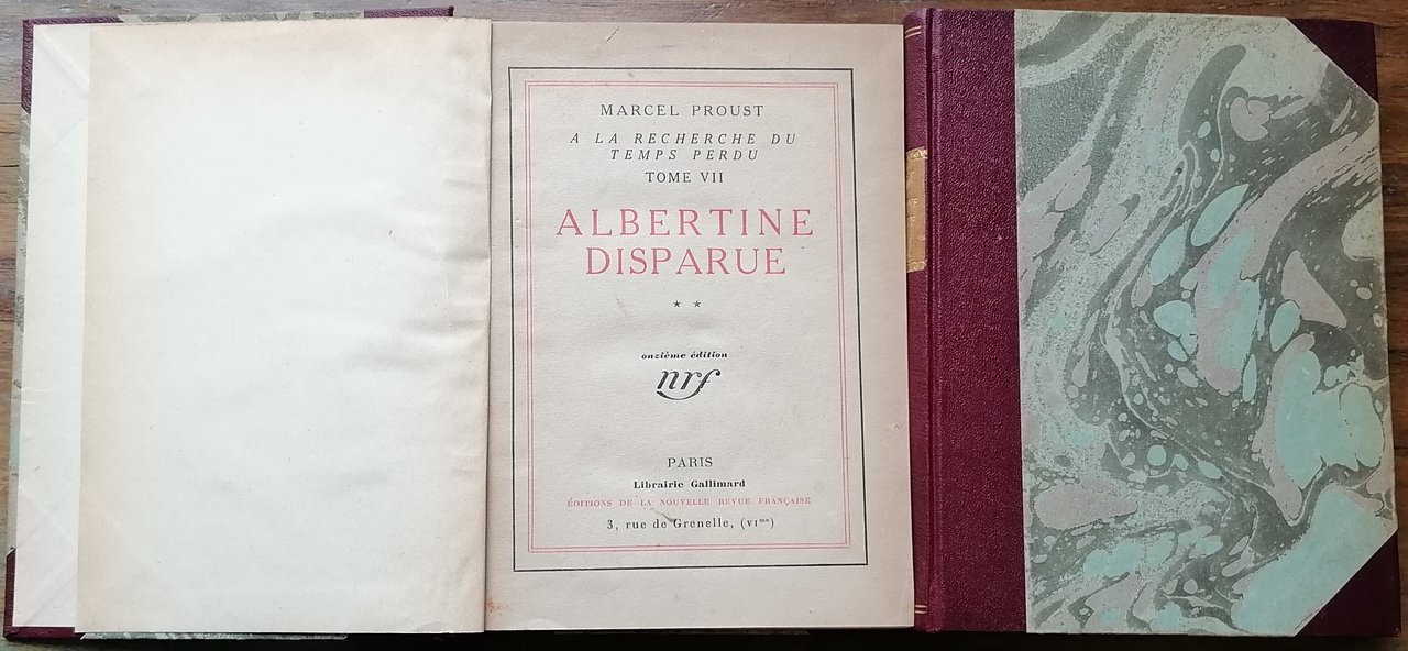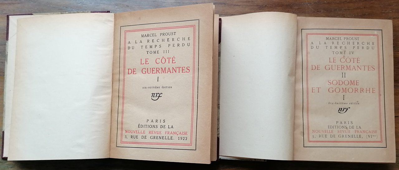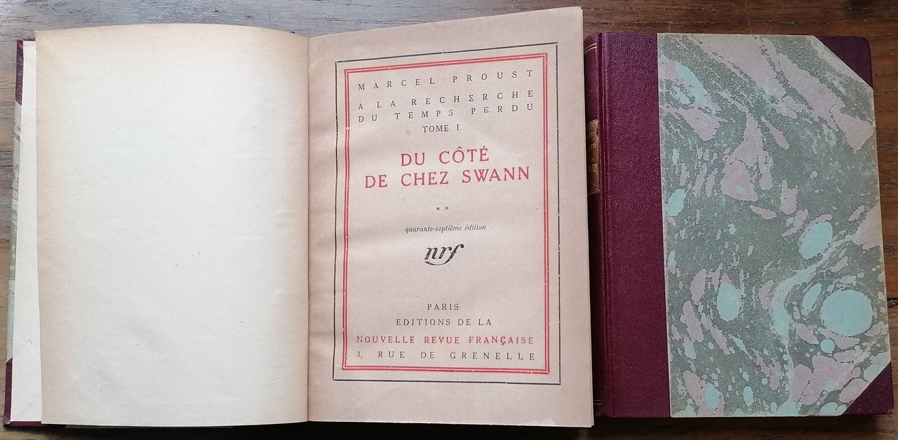 Editions de la Nouvelle Revue Français. Quindici volumi (cm 18 x 13,5), legature coeve in mezza tela con punte, carta marmorizzata ai piatti, conservate le copertine delle brossure originali. "Du coté de chez Swann" (1924, due volumi, pp. 203 ; 190). "A l'ombre des jeunes filles en fleurs" (1924, due volumi, pp. 250 ; 232). "Le coté de Guermantes" + "Sodome et Gomorrhe I" (1920-1923, due volumi, pp. 280 ; 282). "Sodome et Gomorrhe II" (1924, tre volumi, pp. 232 ; 238 ; 240). "La prisonnière" (1923-1924, due volumi, pp. 282 ; 290). "Albertine disparue" (1925, due volumi, pp. 228 ; 216). "Le temps retrouvé" (1927, due volumi, pp. 240 ; 262). Volumi in ottimo stato di conservazione con lieve e naturale ingiallimento della carta.