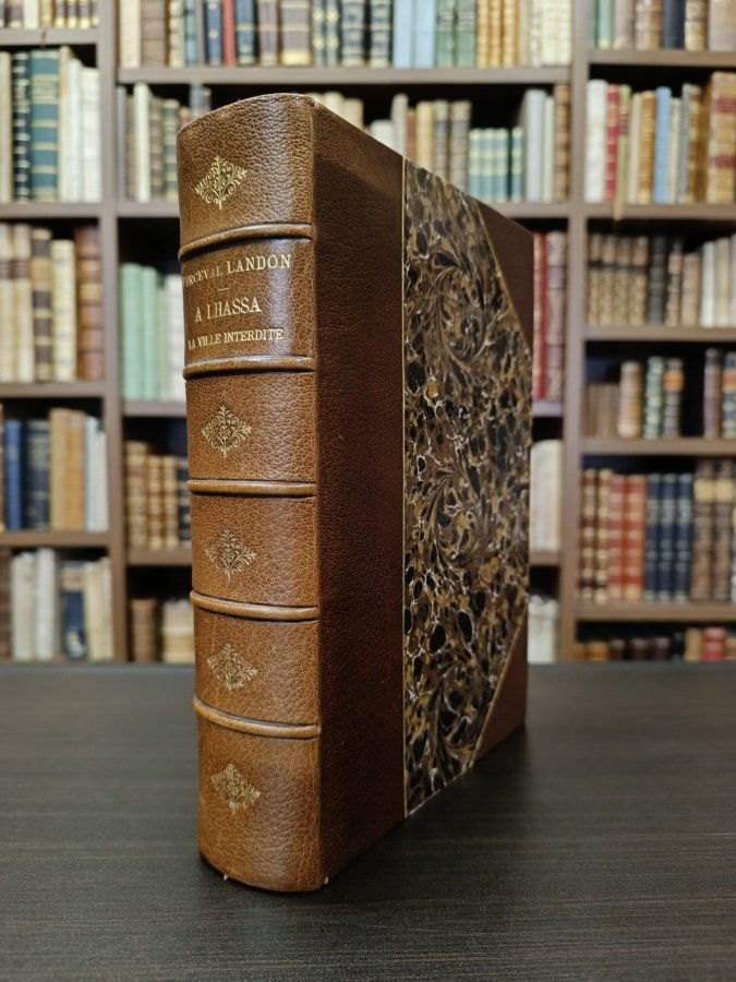 <span style="font-style: normal;">In-8° (cm. 23,2), bella legatura d'amatore in mezza pelle ad angoli, dorso a nervi con titolo ed eleganti fregi floreali in oro ai comparti, risguardi in carta decorativa; conservata la brossura editoriale illustrata a colori; pp. VII [1] 449 [3] in ottimo stato; con 23 tavole eliografiche in nero fuori testo protette da veline didascaliche e 1 carta geografica ripiegata sempre fuori testo in fine. Prima edizione francese di </span><i>Lhasa. An account of the country and people of central Tibet and of the progress of the mission sent there by the English government in the year 1903-1904</i><span style="font-style: normal;">, fra i più significativi resoconti del tempo di viaggio in Tibet, frutto delle corrispondenze del Landon per il </span><i>Times</i>. Il Landon fu uno dei primi europei a descrivere in dettaglio la città sacra di Lhasa. Ottimo esemplare. (NC3)