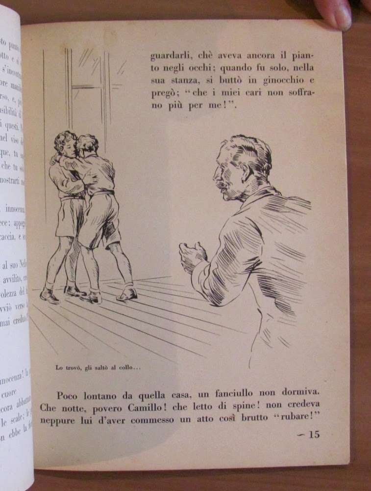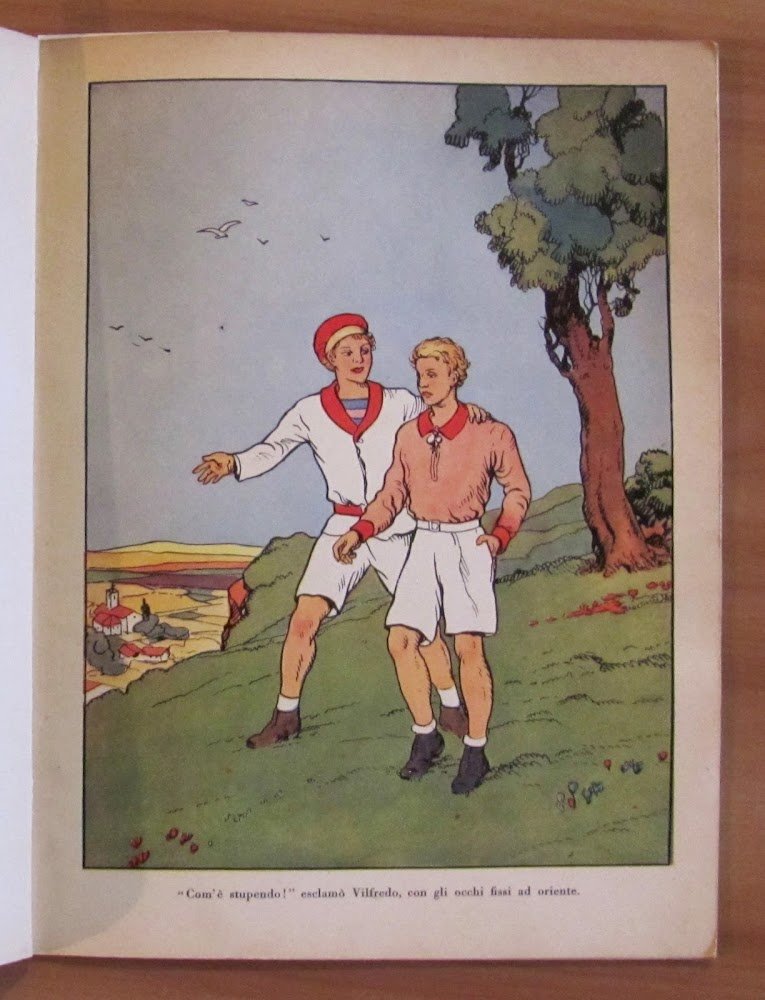4 belle tavole a colori f.t. e 4 illustrazioni in b/n n.t. di Chiletto. Casa Editrice Pro Familia, Milano, I edizione anni '40. Cartoncino editoriale con dorso in tela originale con spille brunite. Numeri a penna in copertina e lieve coloritura a pastelli alla prima illustrazione in b/n, peraltro freschissimo e pulito. 20,5x26; pp.16. Raro e in Buonissimo stato. , Molto buono (Very Good)