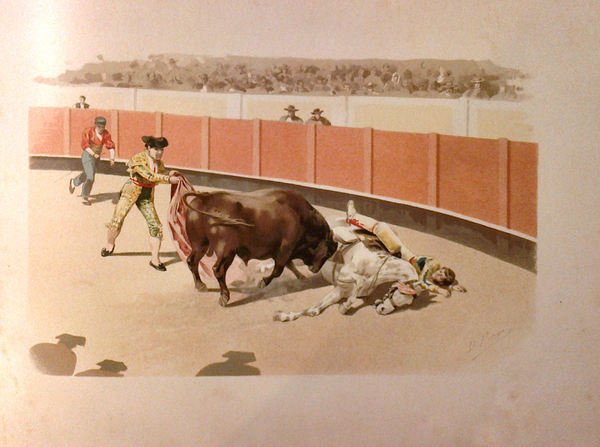 A los toros. Album compuesto de 28 acuarelas originales del reputado pintor de escenas taurinas Don Daniel Perea con la explicación de cada suerte en español, francés e inglés conteniendo además la Marcha de la Manolería de la Zarzuela Pan y Toros ilustrada por el mismo artista.