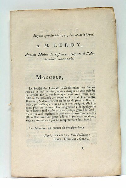 2 pages. (22x14 Cm). Broché. Non rogné, légèrement froissé. Rares rousseurs. Mise en garde des jacobins à l'ancien maire de Lisieux pour avoir voté en faveur du ministre Bertrand de Moleville accusé de conspirations royalistes. Elle est suivie d'une véhémente réponse de l'intéressé. Révolution. Normandie.