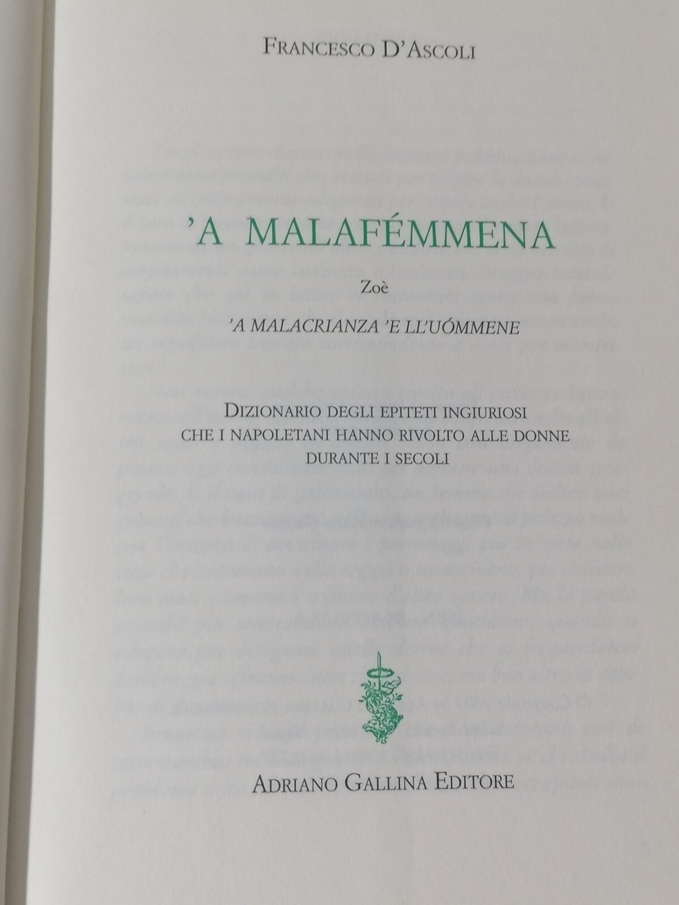 A Malafemmena Zoè A Malacrianza e Ll'uommene Libro D'Ascoli 8887350752 Napoli