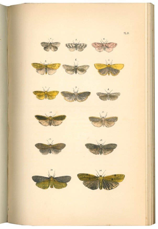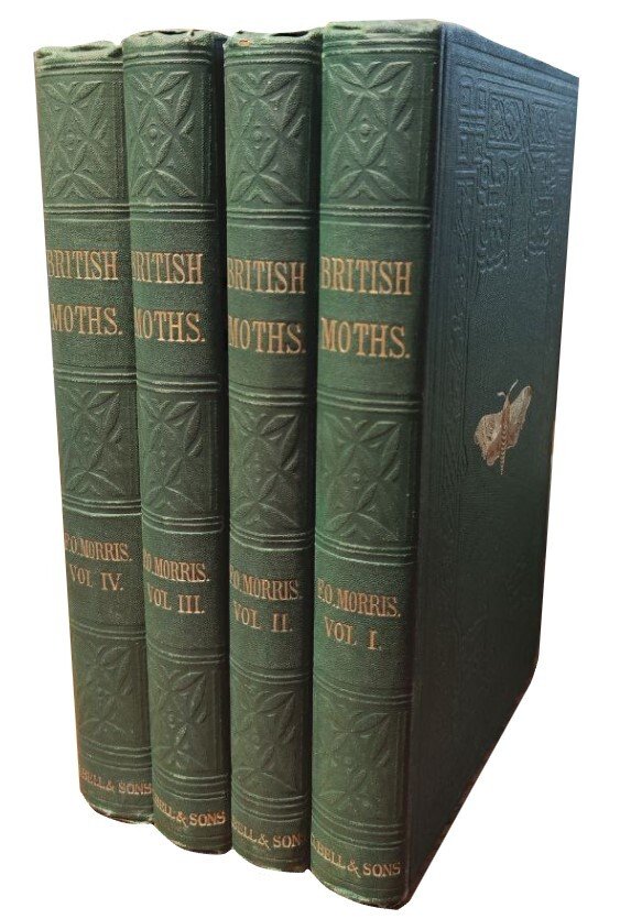 4 volumi. In 8vo. Vol. I: pp. XVI, 253; vol. II: pp. IV, 180; vol. III: pp. IV, 223; vol. IV: pp. V, 321. Presenti 132 tavole a colori riportanti più di 2000 specie. Rilegato in tela editoriale verde con titolo in oro al dorso e motivo dorato con falena al piatto anteriore (alcune cc. risultano staccate, cuffie lievemente usurate).