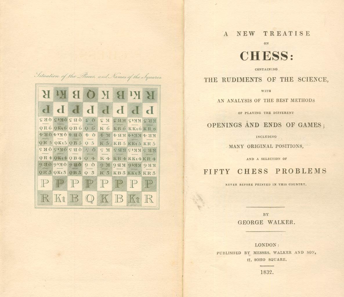 In-16 gr. (mm. 186x112), tela editoriale, pp. (4),80, con 1 tav. in tinta che riporta la situation of the Pieces, and names of the Squares. Il trattato contiene: The rudiments of the science, with an analysis of the best methods of playing the different openings and ends of games; including many original positions, and a selection of fifty Chess problems, never before printed in this country.Ben conservato.