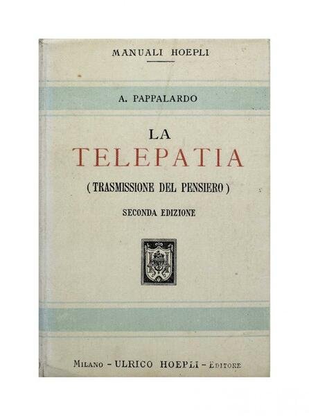 Autore: A. Pappalardo Titolo: La Telepatia Sottotitolo: Trasmissione del pensiero Edizione: Urlico Hoepli Milano 1904 - seconda edizione Dimensioni: 15 x 10,5 cm c.a. Pagine: 279 Copertina: Cartonato Condizioni: Ottime come da foto