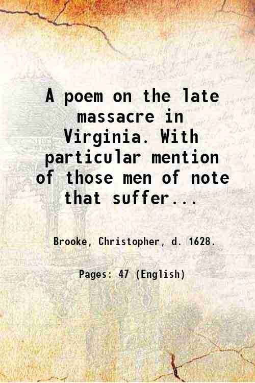 A poem on the late massacre in Virginia. With particular mention of those men of note that suffered in that disaster. Written by C.B. Gent. 1622