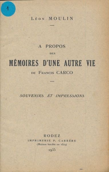 A propos des Mémoires d'une autre vie de Francis Carco. Souvenirs et impressions