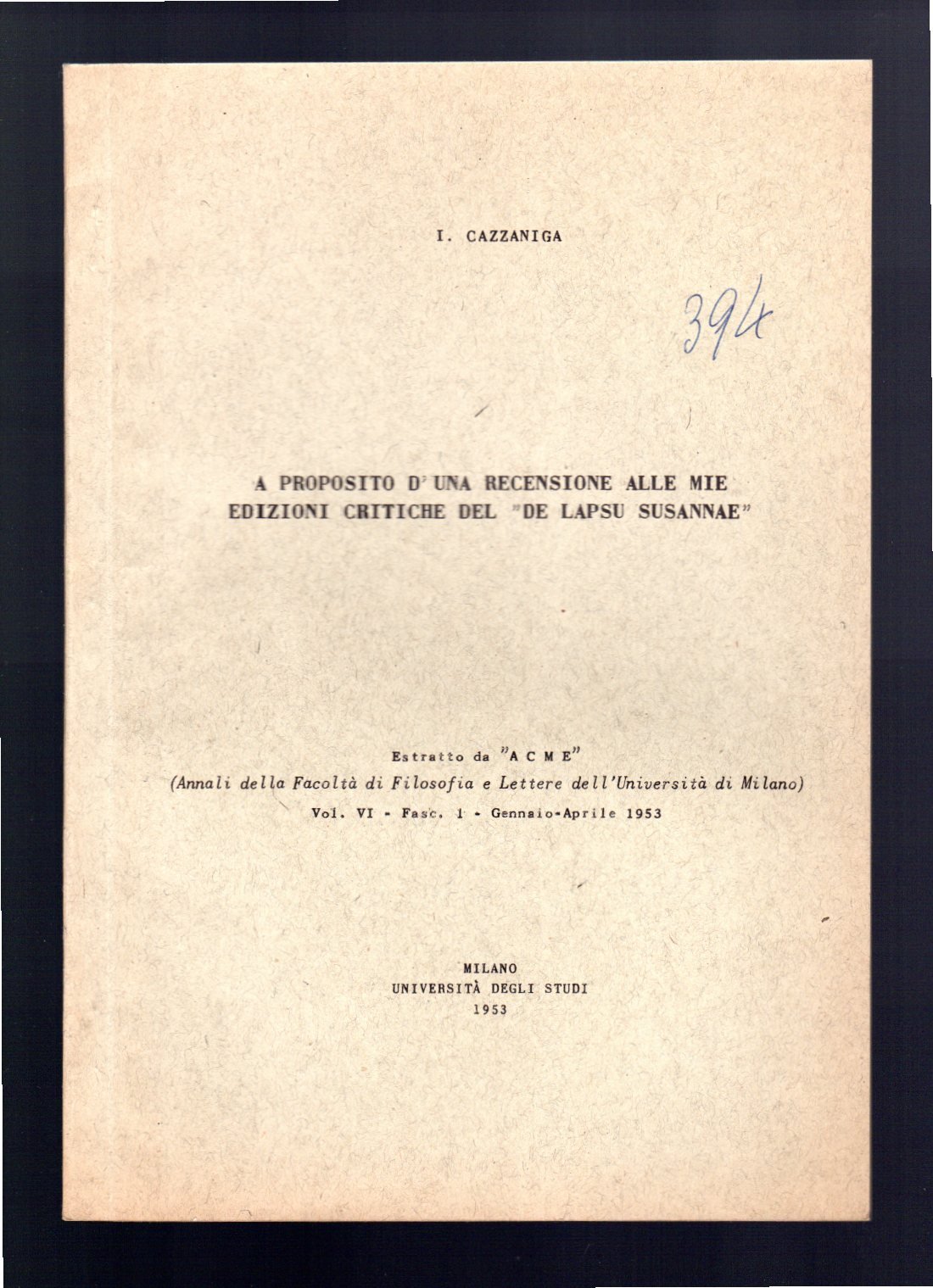 Opuscolo vintage. Estratto da "ACME" (Annali della Facoltà di Filosofia e Lettere dell'Università di Milano) Vol. VI - Fasc. 1 Gennaio-Aprile 1953. Segni di biro in copertina. Leggero segno del tempo.