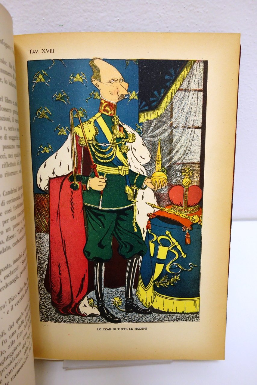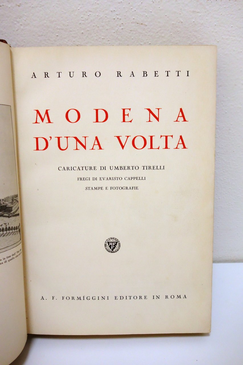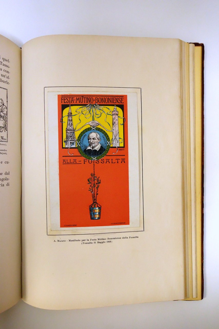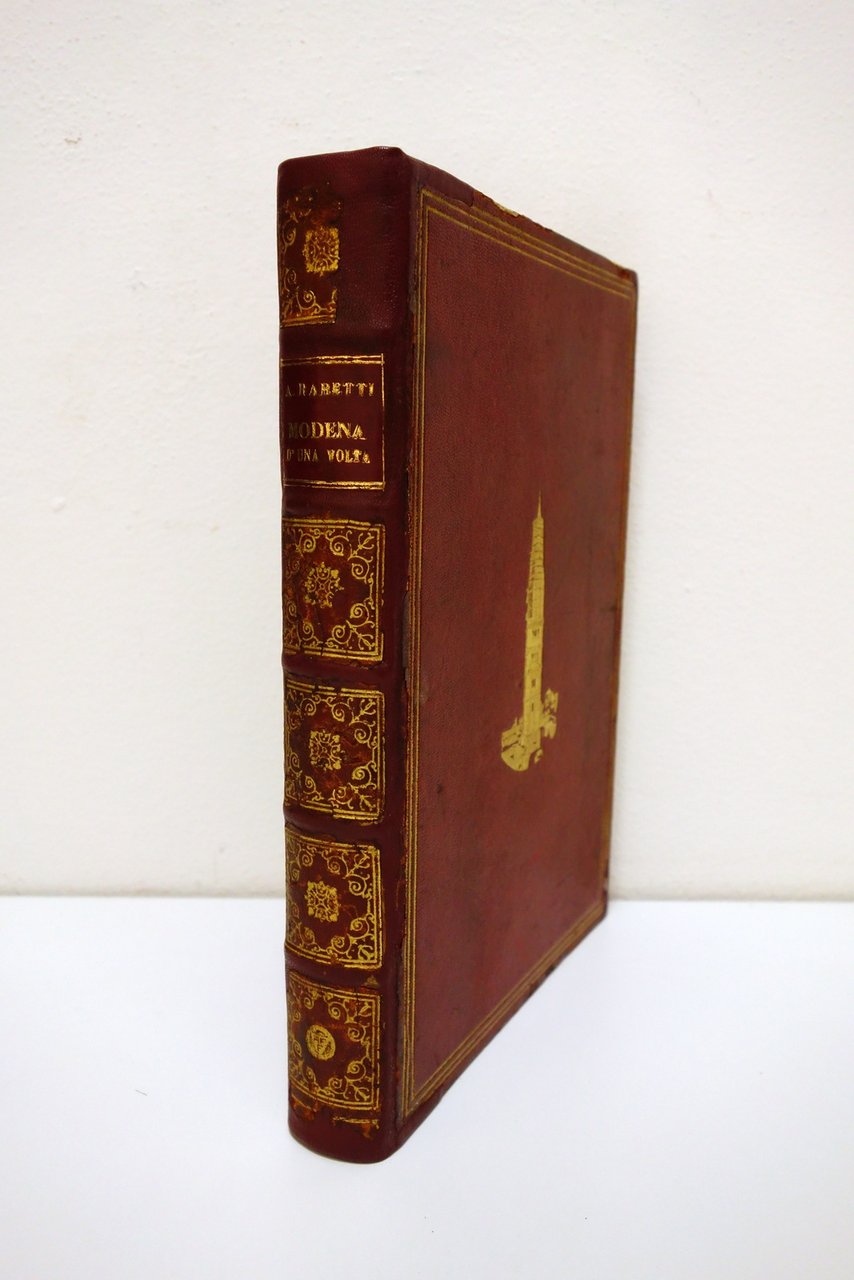 A. F. Formiggini Editore, Roma, 1937; cm 28,5x19; pp. XVI-360 con numerose ill. in b/n nel t., XXXVI belle tavole cromolitografiche fuori t. di U. Tirelli, una cartolina ill. a colori celebrativa della festa mutino - bononiense della Fossalta applicata fuori t. Bella legatura d'epoca in marocchino realizzata da Rolando Gozzi di Modena, con titolo e bei fregi impressi in oro al dorso; al piatto anteriore impresso fine fregio dorato raffigurante la torre Ghirlandina. Conservata la legatura ed. originale in cartoncino ill. in b/n. Esemplare numerato, n/s 545 di 748 copie.