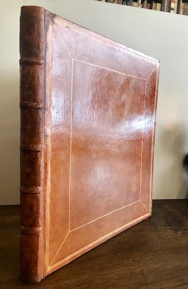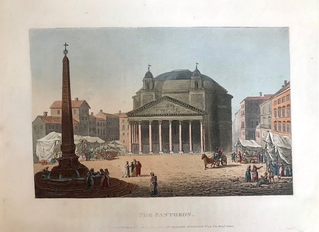 Folio (cm. 38,5x34,5), Frontespizio architettonico e 61 splendide tavole litografiche (di cui una in antiporta), il tutto acquarellato a mano all’epoca. Accompagnano il ricco apparato iconografico 36 cc.nn. di testo descrittivo in inglese e francese. Legatura inglese coeva in vitellino biondo con cornici concentriche in oro ai piatti. Ds. con nervi, piccoli fregi e titolo impresso in oro (abilmente rinnovato con utilizzo di materiale originario). Sulle carte di guardia anteriori sono presenti una porzione di brossura editoriale che testimonia l’edizione ‘large paper’ e la coloritura ‘after the original’ ed un foglio di vendita di Libreria antiquaria di Lisbona datato 1948. Ex libris di collezione privata cardinalizia su una carta bianca preliminare. Esemplare in ottimo stato di conservazione, privo delle abituali fioriture. Tavole datate 1796-1798 con filigrana ‘J. Whatman Turkey Mill’. Rara edizione che si distingue da quella ordinaria per la maggiore rarità, per il formato in Folio e per la bellissima acquarellatura delle vedute. Cfr. Rossetti, 7007.