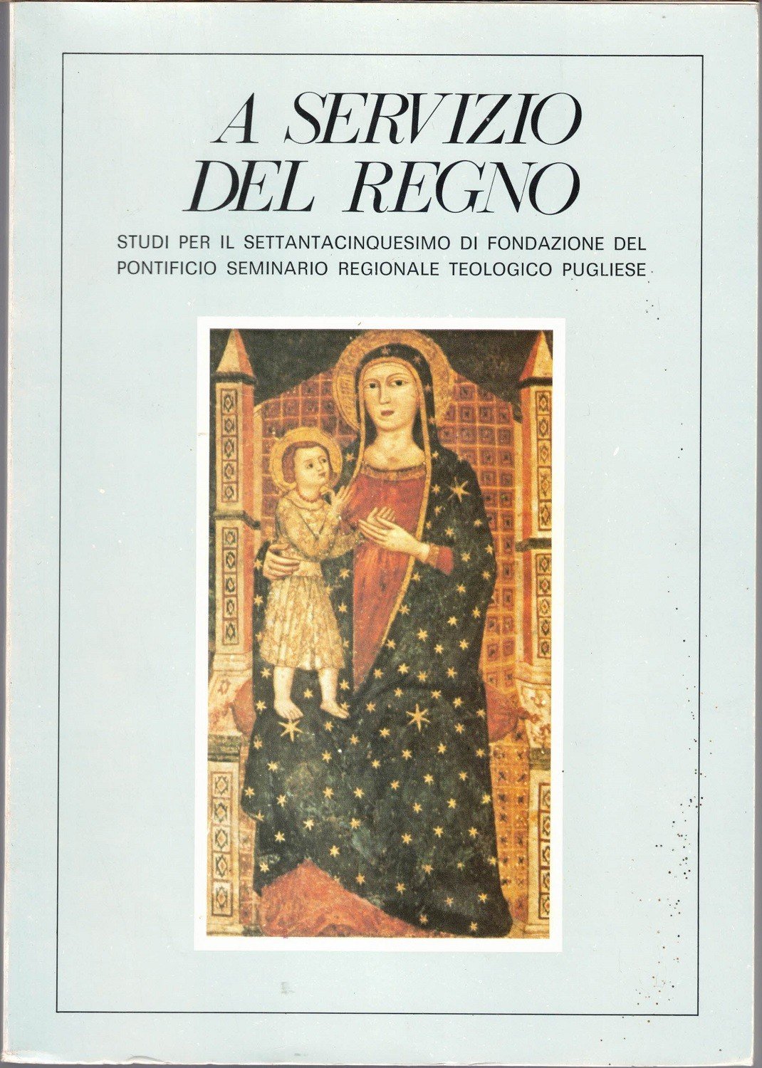 A servizio del Regno. Studi per il 75° di fondazione del Pontificio Seminario Regionale Teologico Pugliese, a cura di Cesare Colafemmina, Mezzina 1983, Molfetta 272, 1ll. b.n., cm 25, br. ed. Indice: Premessa – Mons. Tommaso Tridente, Sguardo retrospettivo – Marcello Semeraro, Spirito, fuoco ed Eucarestia – Antonio Resta, Chiesa locale e Trinità: appunti per una teologia di comunione – Mauro Cozzoli, Lineamenti di metaetica ed etica sacramentale – Franco Castellana, Simone Weil: un itinerario a Dio, o lo yoga du coup de tête – Pio Zuppi, Il catechismo Signore da chi andremo? Aspetti e orientamenti liturgici del testo – Giovanni Nuzzo, Divagazioni intorno al nuovo Codice di Diritto Canonico – Raffaele Coppola, L’efficacia civile della giurisdizione ecclesiastica matrimoniale oggi in Italia – Vito Orlando, Marianna Pacucci, La distruzione del clero nelle diocesi pugliesi: analisi socio-statistica in prospettiva pastorale – Felice di Molfetta, Ispirazione biblica delle Orazioni Ad matutinas e Ad vesperum del Sacramentario Gelasiano – Cesare Colafemmina, Tende distudio della Torah e fiumi a Oria nel IX secolo – Salvatore Paese, Monumenti e devozioni medievali nel basso Salento – Appendice (Pio XII, Discorso preparato per il 50° del Seminario Regionale Pugliese – Giovanni Paolo II, Omelia rivolta il 13 gennaio 1980 alla comunità del Seminario Teologico Regionale Pugliese). Minime tracce d’uso alla brossura, per il resto ottimo.