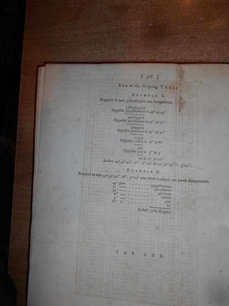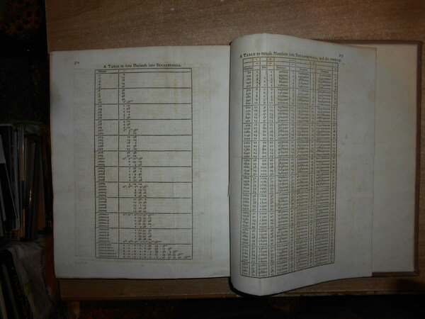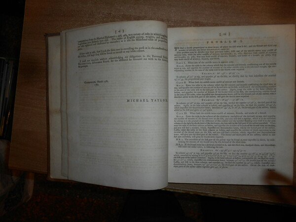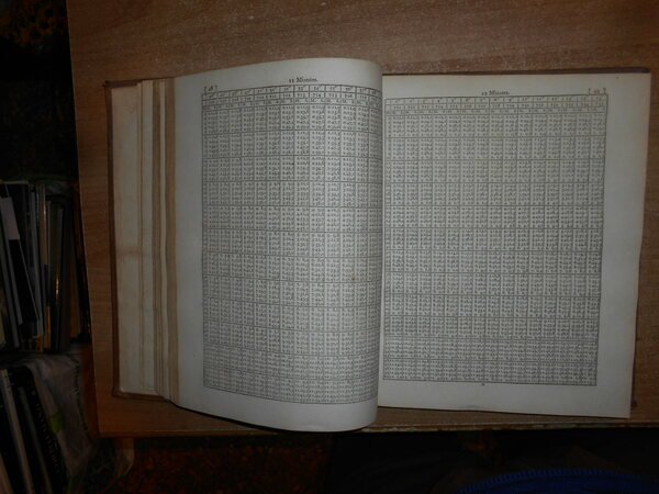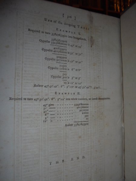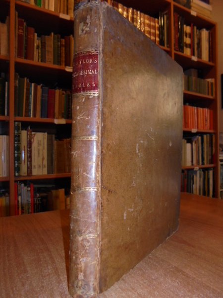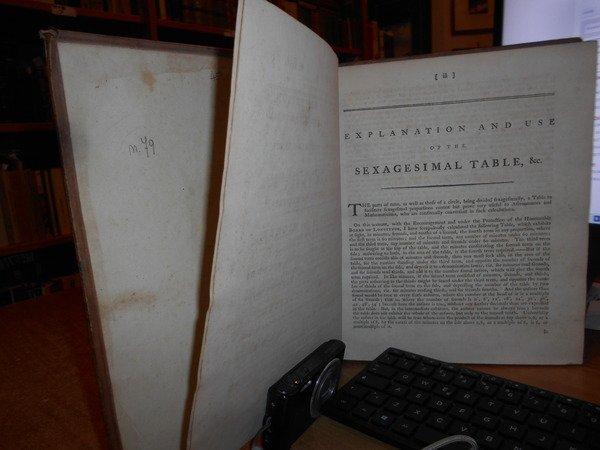 A SEXAGESIMAL TABLE, EXHIBITING AT SIGHT, THE RESULT OF ANY PROPORTION, WHERE THE TERMS DO NOT EXCEED SIXTY MINUTES ALSO TABLES OF THE EQUATION OF SECOND DIFFERENCE, AND TABLES FOR TURNING THE LOWER DENOMINATIONS OF ENGLISH MONEY, WEIGHTS, AND MEASURES, INTO SEXAGESIMALS OF THE HIGHER, AND VICE VERSA. AND THE SEXAGESIMAL TABLE TURNED INTO SECONDS AS FAR AS THE 1000TH COLUMN, BEING A VERY USEFUL MILLESIMAL TABLE OF PROPORTIONAL PARTS. WITH PRECEPTS AND EXAMPLES. IN - 4° GR., PIENA PELLE COEVA. XLV, (3), 316 PP. CON UNA TABELLA PIÙ VOLTE RIPIEGATA F.T. CARTA, COME SEMPRE, LEGGERMENTE INGIALLITA, MA ESEMPLARE BEN CONSERVATO. EDIZIONE ORIGINALE. RARE. THE LARGEST SEXAGESIMAL TABLE EVER ISSUED. IT WASS PUBLISHED BY ORDER OF THE COMMISSIONERS OF LONGITUDE. (ZEITLINGER). POGGENDORFF, II, 1072. Uff. stanz. antic. mob. 1