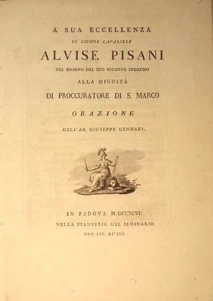 A sua eccellenza il signor cavaliere Alvise Pisani nel giorno del suo solenne ingresso alla dignita di proccuratore di S. Marco orazione dell'ab. Giuseppe Gennari