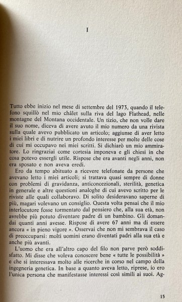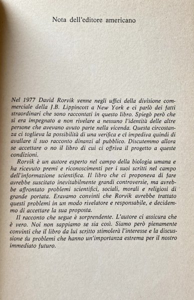 David Rorvik, giornalista, è autore di alcuni libri divulgativi in campo scientifico. In edizione italiana sono apparsi I figli innaturali (Bompiani) e Il sesso del vostro bambino (in collaborazione con L.D. Shettles, Rizzoli). Nota dell'editore americano Nel 1977 David Rorvik venne negli uffici della divisione commerciale della J.B. Lippincott a New York e ci parlò dei fatti straordinari che sono raccontati in questo libro. Spiegò però che si era impegnato a non rivelare a nessuno l'identità delle altre persone che avevano avuto parte nella vicenda. Questa circostanza ci toglieva la possibilità di una verifica e ci impediva quindi di avallare il suo racconto dinanzi al pubblico. Discutemmo allora se accettare o no il libro di cui ci offriva il progetto a queste condizioni. Rorvik è un autore esperto nel campo della biologia umana e ha ricevuto premi e riconoscimenti per i suoi scritti nel campo dell'informazione scientifica. Il libro che ci proponeva di fare avrebbe suscitato inevitabilmente grandi controversie, ma avrebbe affrontato problemi scientifici, sociali, morali e religiosi di grande portata. questi problemi in un modo rivelatore e responsabile, e decidemmo di accettare la sua proposta. Eravamo convinti che Rorvik avrebbe trattato Il racconto che segue è sorprendente. L'autore ci assicura che è vero. Noi non sappiamo se sia cosi. Siamo però pienamente convinti che il libro da lui scritto stimolerà l'interesse e la discussione su problemi che hanno un'importanza estrema per il nostro immediato futuro.