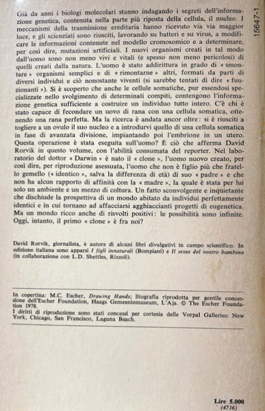 Già da anni i biologi molecolari stanno indagando i segreti dell'informazione genetica, contenuta nella parte più riposta della cellula, il nucleo. I meccanismi della trasmissione ereditaria hanno ricevuto via via maggior luce, e gli scienziati sono riusciti, lavorando su batteri e su virus, a modificare le informazioni contenute nel modello cromosomico e a determinare, per cosi dire, mutazioni artificiali. I nuovi organismi creati in tal modo dall'uomo sono non meno vivi e vitali (e spesso non meno pericolosi) di quelli creati dalla natura. L'uomo è stato addirittura in grado di smontare organismi semplici e di rimontarne altri, formati da parti di diversi individui e ciò nonostante viventi (si sarebbe tentati di dire funzionanti). Si è scoperto che anche le cellule somatiche, pur essendosi specializzate nello svolgimento di determinati compiti, contengono l'informazione genetica sufficiente a costruire un individuo tutto intero. C'è chi è stato capace di fecondare un uovo di rana con una cellula somatica, ottenendo una rana perfetta. Ma la ricerca è andata ancora oltre: si è riusciti a togliere a un ovulo il suo nucleo e a introdurvi quello di una cellula somatica in fase di avanzata divisione, impiantando poi l'embrione in un utero. Questa operazione è stata eseguita sull'uomo? E ciò che afferma David Rorvik in questo volume, con l'abilità consumata del reporter. Nel laboratorio del dottor Darwin è nato il clone, l'uomo nuovo creato, per così dire, per riproduzione asessuata, l'uomo che non è figlio più che fratello gemello (identico, salva la differenza di età) di suo padre e che non ha alcun rapporto di affinità con la madre, la quale è stata per lui solo un ambiente e un mezzo di coltura. Un fatto sconvolgente e inquietante che dischiude la prospettiva di un mondo abitato da individui perfettamente identici e in cui tornano ad affacciarsi agghiaccianti progetti di eugenetica. Ma un mondo ricco anche di risvolti positivi: le possibilità sono infinite. Oggi, intanto, il primo clone è fra noi?
