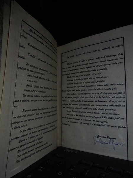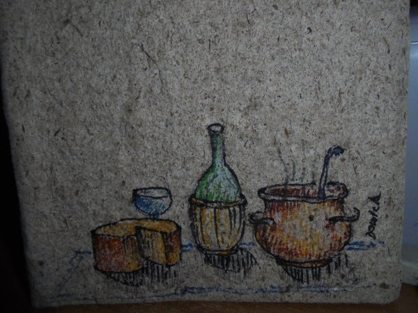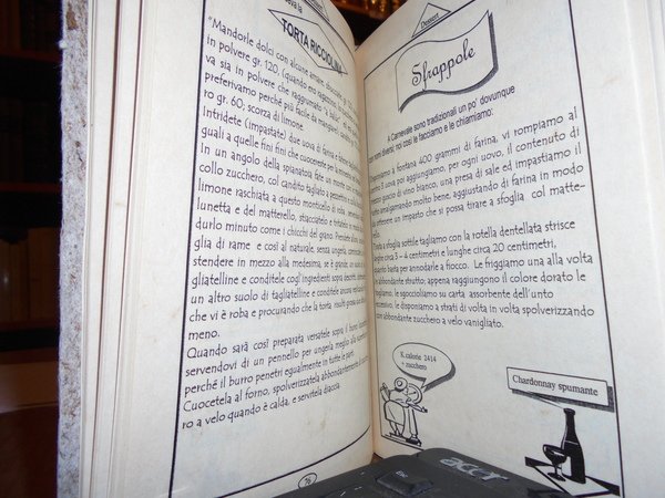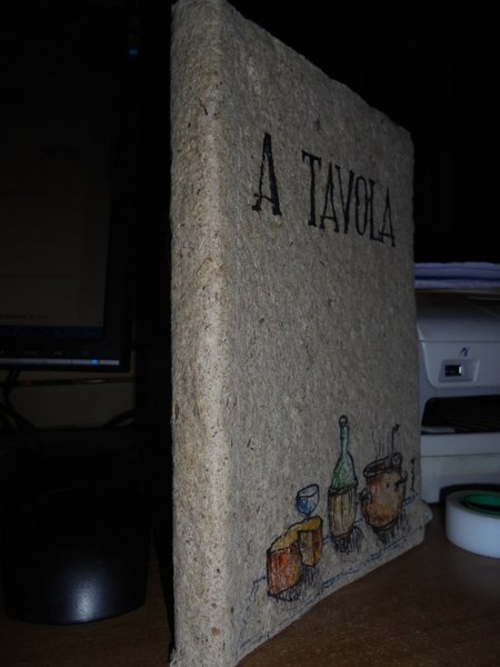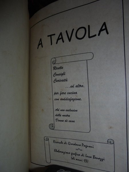 Ricerche di Giordano Pagnoni. Senza data (anni '60). A tavola. Ricette, consigli, curiosità .ed altro per fare cucina con soddisfazione. Ad uso esclusivo delle nostre Donne di casa. Elaborazione grafica di Luca Benazzi (di anni 13). In-8°, copertine in cartone alla rustica (amatoriale), scritta e disegno eseguito a mano. 172 pp. a pag. 3 firma dell' Autore. Libro originale introvabile con ricette, consigli e proverbi bolognesi degli anni '60. Neg. cucina. mob. 15. carc.