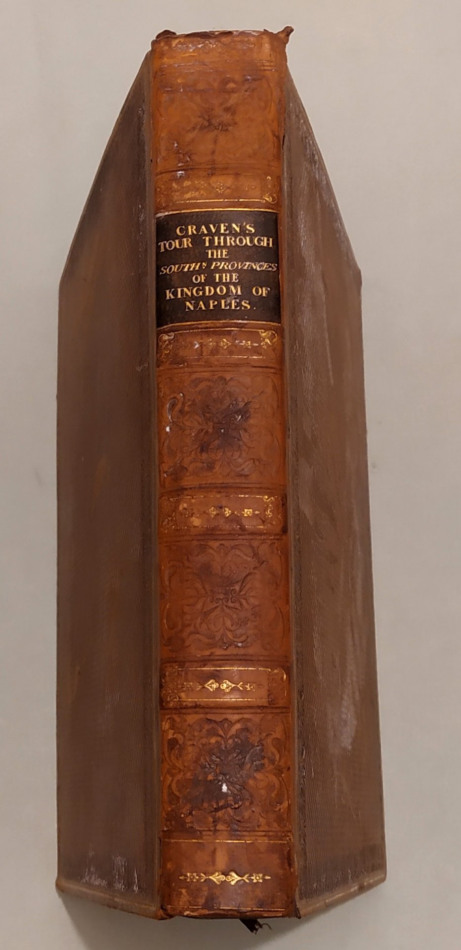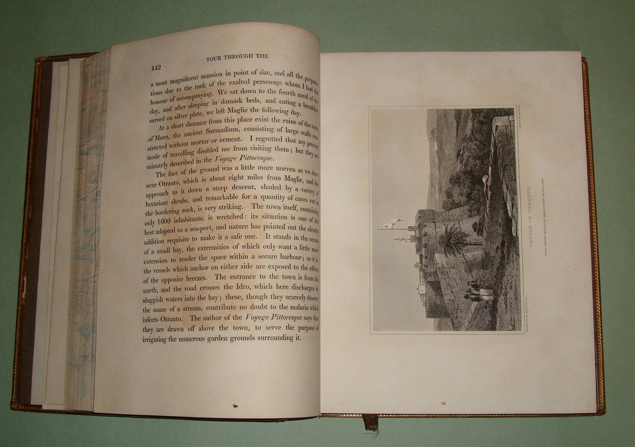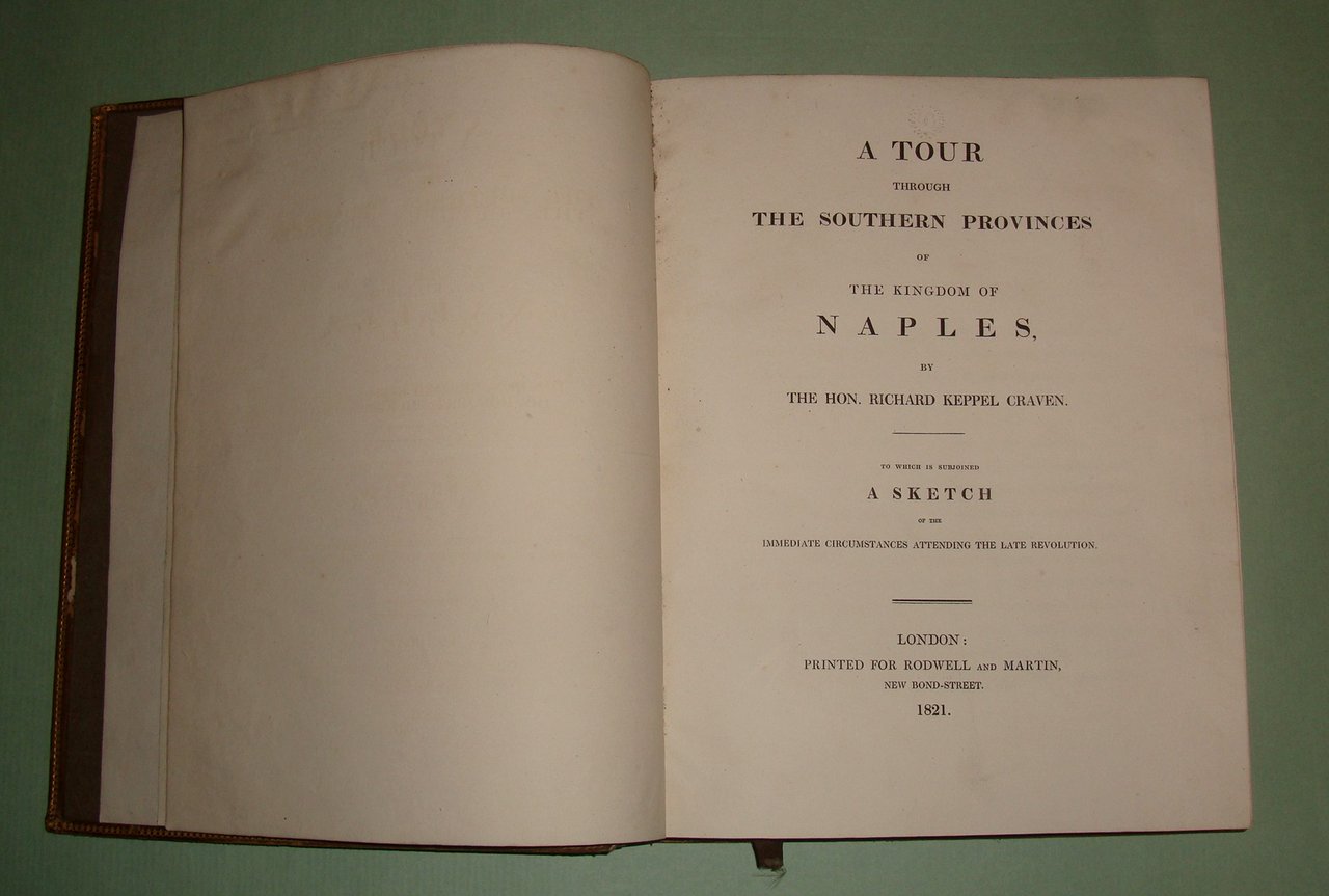 CRAVEN Keppel Richard. A Tour through the southern provinces of the Kingdom of Naples. To which is subjoined a sketch of the immediate circumstances attending the late revolution. London, printed for Rodwell and Martin, 1821. In 4to; pp.XI, 1 n.nn., 449. Pelle coeva, piatti inquadrati da fregi a secco ed in oro; dorso a cordoni con fregi floreali in nero e decorazioni in oro, tassello con titoli in oro. Tagli marmorizzati. Lievi abrasioni ai piatti, una cuffia lacera. 14 tavole fuori testo con vedute di Benevento, Lucera, Polignano, Otranto, Brindisi, Taranto, Messina, Nicastro, Salerno. Opera rara, ricca di annotazioni sulle abitudini, i costumi, le tradizioni delle popolazioni del Sannio, la Calabria, la Lucania, la Puglia. La provincia di Salerno, Amalfi, Ravello e i Galli. La penisola sorrentina e l’isola di Capri. Un intero capitolo dedicato alla zona vesuviana. In appendice la cronaca dei moti rivoluzionari del 1820. Invio autografo dell’autore. Pine Coffin, 818.2.