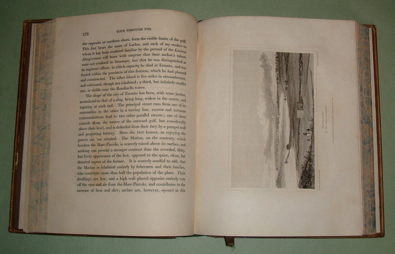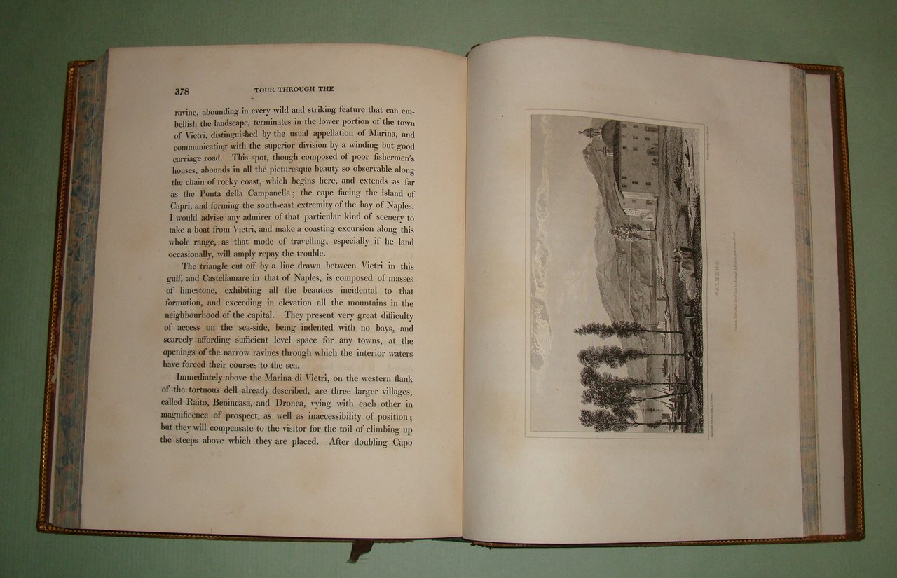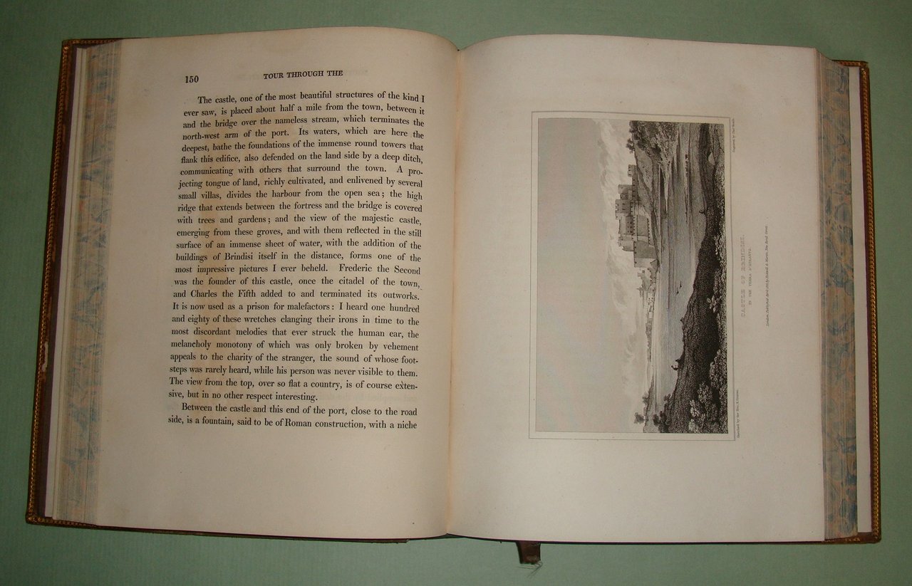 CRAVEN Keppel Richard. A Tour through the southern provinces of the Kingdom of Naples. To which is subjoined a sketch of the immediate circumstances attending the late revolution. London, printed for Rodwell and Martin, 1821. In 4to; pp.XI, 1 n.nn., 449. Pelle coeva, piatti inquadrati da fregi a secco ed in oro; dorso a cordoni con fregi floreali in nero e decorazioni in oro, tassello con titoli in oro. Tagli marmorizzati. Lievi abrasioni ai piatti, una cuffia lacera. 14 tavole fuori testo con vedute di Benevento, Lucera, Polignano, Otranto, Brindisi, Taranto, Messina, Nicastro, Salerno. Opera rara, ricca di annotazioni sulle abitudini, i costumi, le tradizioni delle popolazioni del Sannio, la Calabria, la Lucania, la Puglia. La provincia di Salerno, Amalfi, Ravello e i Galli. La penisola sorrentina e l’isola di Capri. Un intero capitolo dedicato alla zona vesuviana. In appendice la cronaca dei moti rivoluzionari del 1820. Invio autografo dell’autore. Pine Coffin, 818.2.