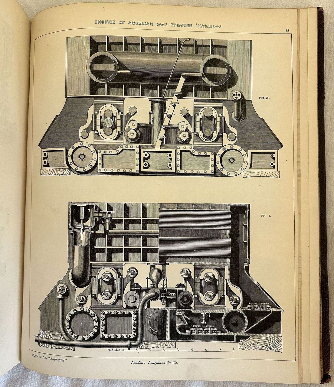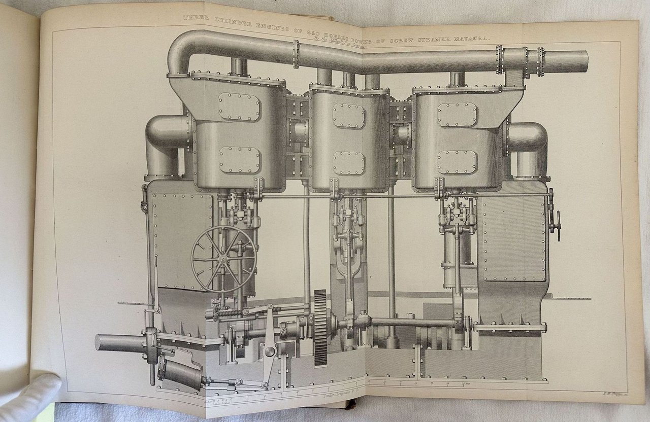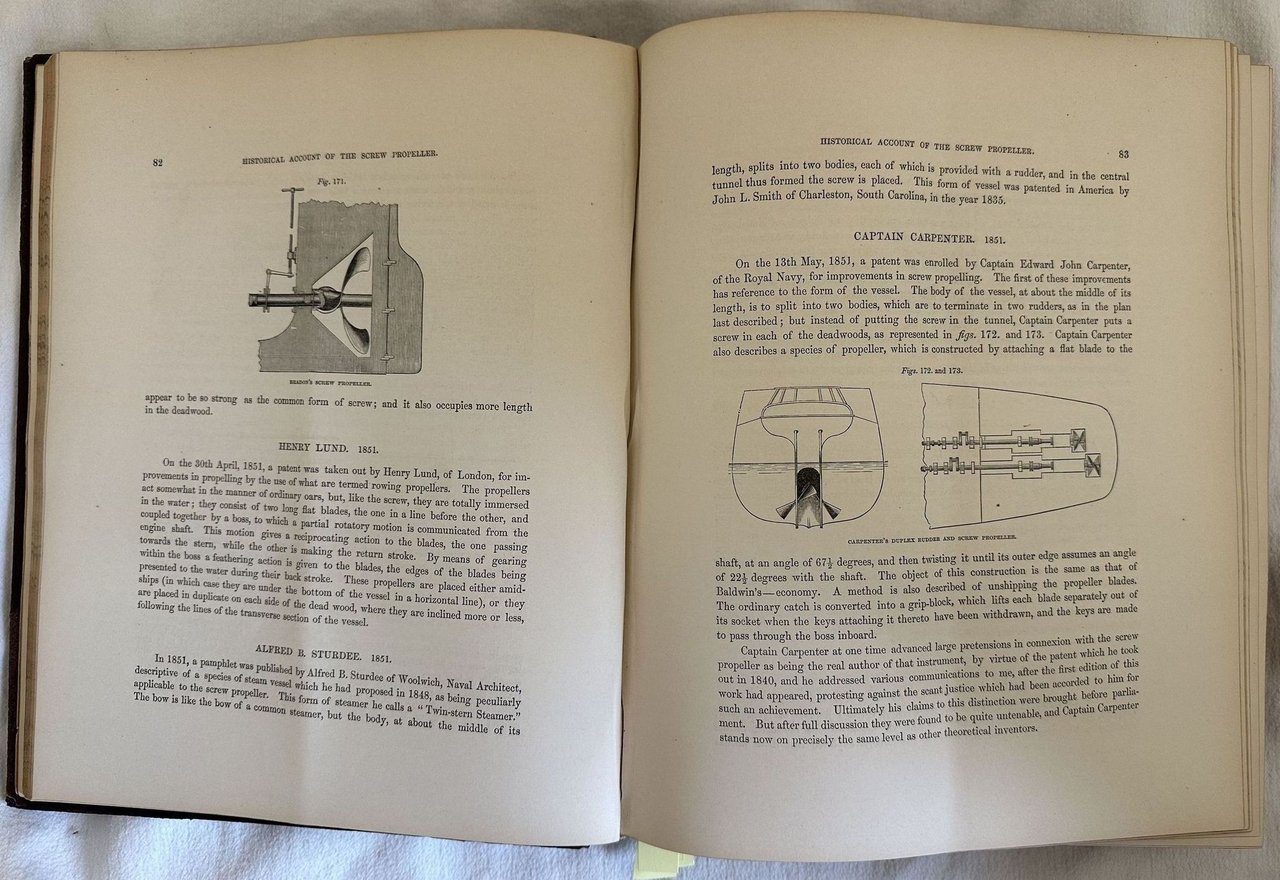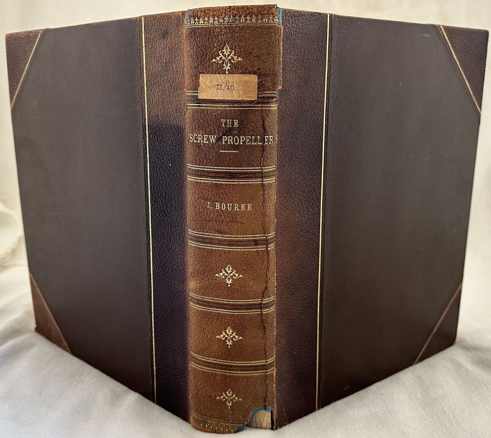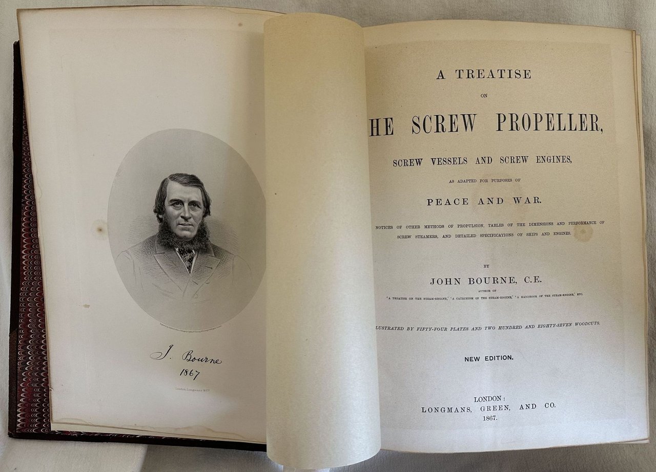 Edizione del 1867 di questo interessante trattato sulla costruzione delle viti per barche, vascelli e motori in generale di John Bourne. All'interno sono presenti numerose illustrazioni nel testo e diverse tavole fuori testo una delle quali il ritratto dell'autore in antiporta. Approfondita e ampia descrizione dei tipi di vite suddivise perfino in base ai tipi di nave: commerciale, da guerra, barche. In buone condizioni. Copertina in mezza pelle con titolo e decorazioni in oro al dorso in buone condizioni con usure marginali e parti mancanti al dorso. Legatura in buone condizioni. Pagine in buone condizioni con fioriture. Piegatura verticale. In 4. cm. 31,5x25,5. Pp. XXII+428+CXXIIIEdition of 1867 of this interesting treaty about the construction of screw propellers, screw vessels and screw engines by John Bourne. inside there are different illustrations and different out of text plates, one of them the portrait of the author in the frontspice. Wide and well explained description of different kind of screws divided in different kind of ships: commercial, war, ships. In good conditions. Half leather cover with gilted title and decoration in the spine in good conditions with wearings in the edges and lackings in the spine. Binding in good conditions. Pages in good conditions with foxing. Vertical folding. In 4. cm. 31,5x25,5. Pp. XXII+428+CXXIII
