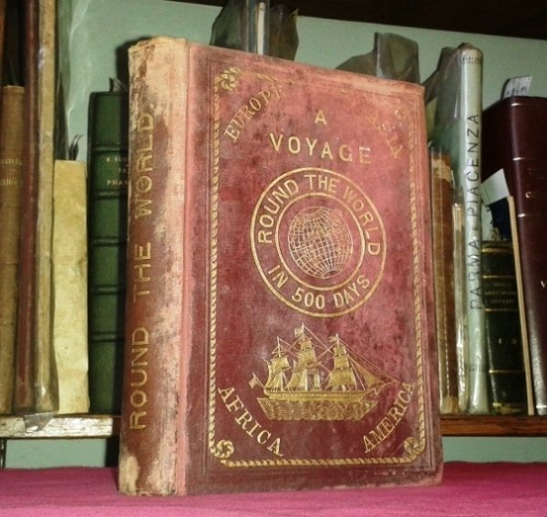 Volume in 8, tela editoriale figurata impressa in oro, titolo al piatto ed al dorso, sguardia, occhiello, grande tavola ripiegata, tavola figurata, frontespizio, dedicatoria, prefazione, XI, 173 pp., 9 tavole illustrate ft. Interessante viaggio intorno al mondo il cui tracciato segnato nella grande carta all'inizio del volume, descrive i pi suggestivi paesaggi visitati dall'Autore illustrandone alcuni con le belle incisioni a piena pagina. Lievi mende d'uso alla legatura nelle prime pagine leggermente lenta. Avvincente.