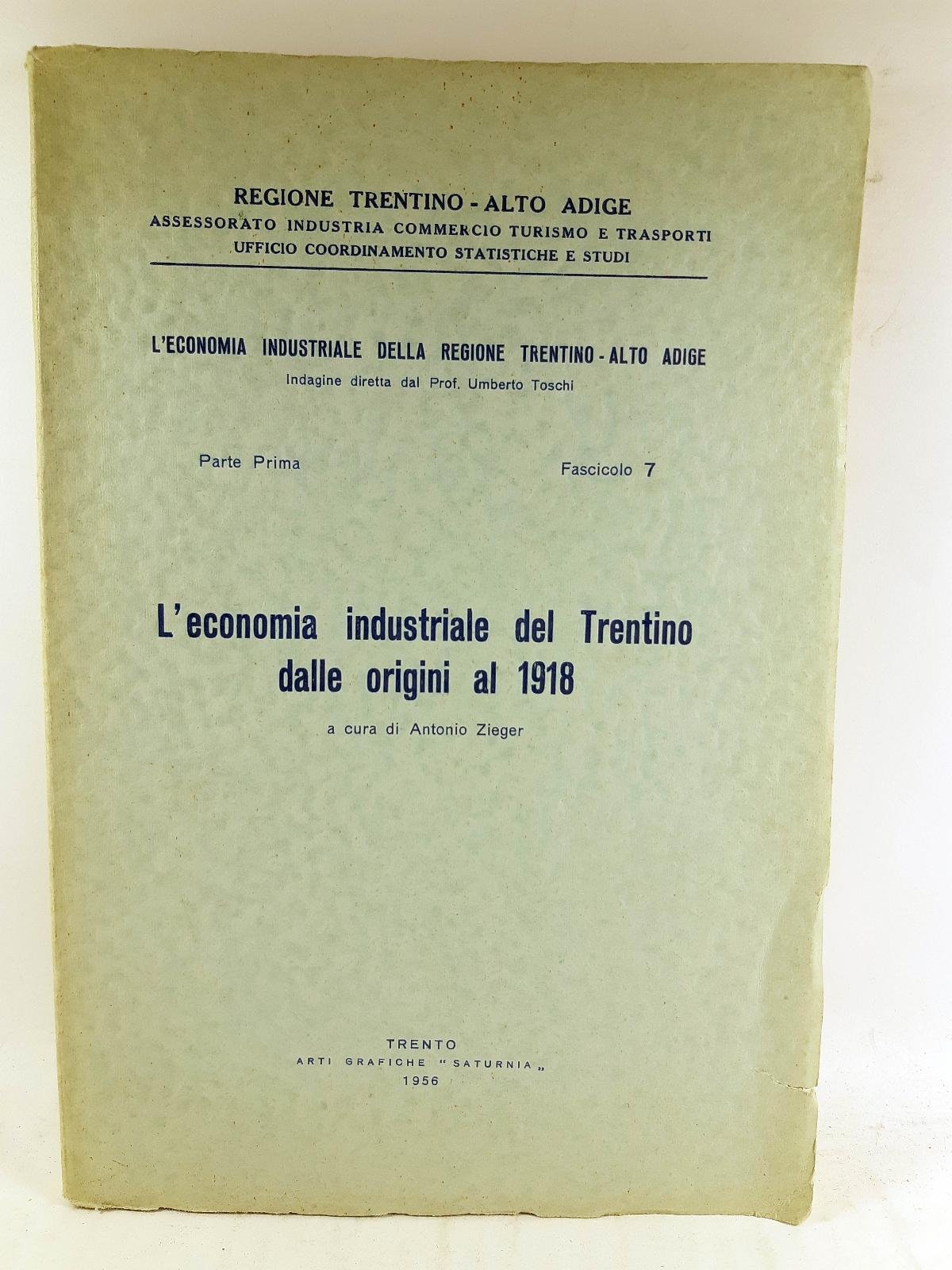 A. Zieger L'economia industriale del Trentino dalle origini al 1918 autografato 1956