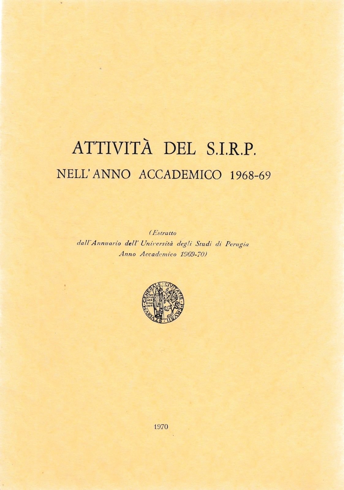 ATTIVITA' DEL S.I.R.P. NELL'ANNO ACCEDEMICO 1968-69 ESTRATTO DALL'ANNUARIO DELL'UNIVERSITA' DI PERUGIA 1970 L4622 COPERTINA MORBIDA EDITORIALE IN OTTIMO STATO CON FOTO IN BN. CM. 21 X 15