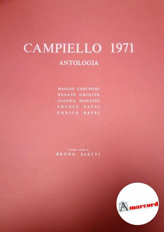 AA.VV., Campiello 1971. Antologia. Fondazione Cini, 1971, brossura editoriale con custodia, pp. 150. Litografie originali di Bruno Saetti. Testi di Manlio Cancogni, Renato Ghiotto, Gianna Manzini, Ercole Patti, Enrico Raffi. Copia 295/1000.