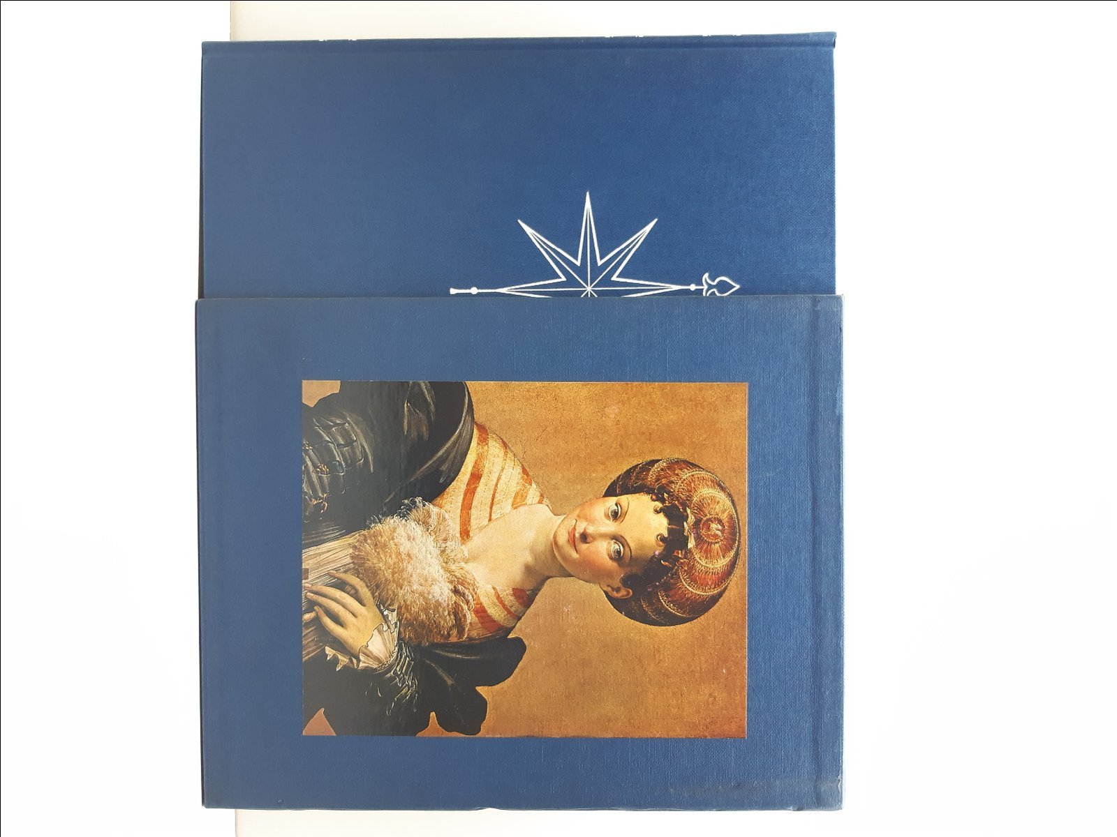 cofanetto rigido editoriale in tela color blu con alcune lievi sporcizie ai piatti, un'ammaccatura al margine posteriore, legatura rigida editoriale in tela blu con fregio al piatto anteriore, titolo in oro al dorso, dorso leggermente brunito, interno in buono stato, fogli di guardia illustrati con carte geografiche, numero pagine 454 + indice dimensioni cm 32 x 26 x 4,8
