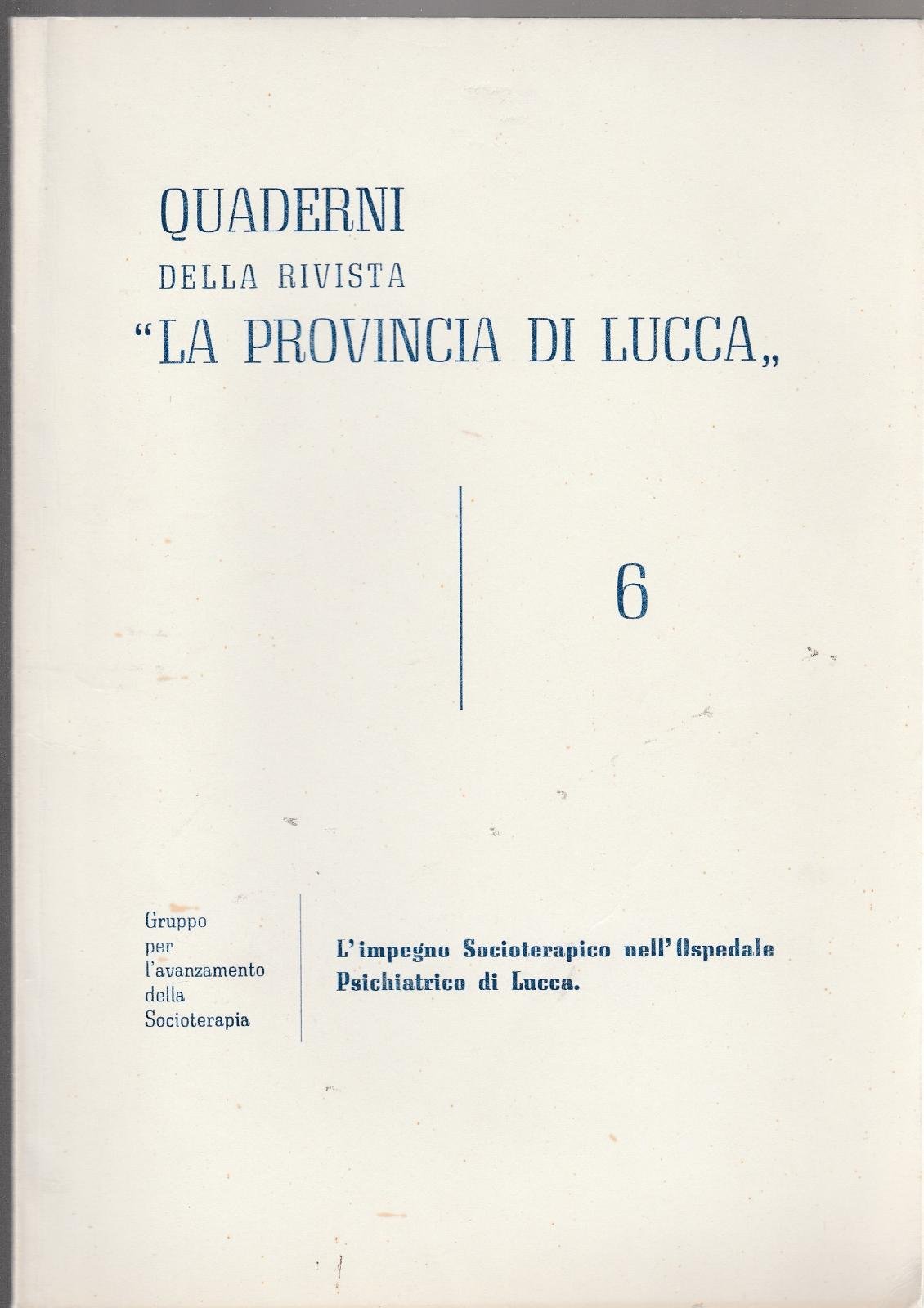 AA.VV. QUADERNI DELLA RIVISTA LA PROVINCIA DI LUCCA L'IMPEGNO SOCIOTERAPEUTICO NELL'OSPEDALE PSICHIATRICO DI LUCCA 1968 L 4569 COPERTINA EDITORIALE MORBIDA, PICCOLISSIME MACCHIE AL PIATTO ANTERIORE, ALLA PRIMA PAGINE DEDICA DI UNO DEGLI AUTORI, INTERNO IN OTTIMO STATO, N. PAG. 52 CM. 23,5 X 16,5