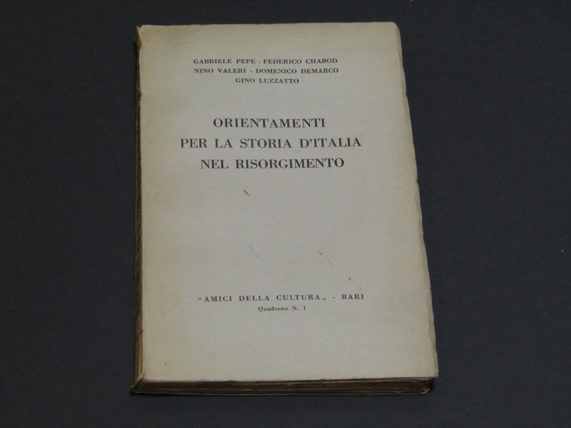 AA.VV. Orientamenti per la storia d'Italia nel Risorgimento. Laterza. 1952. In-8. Brossura. 180 pp. Molto buono. Foxing. Pagine non rifilate. Timbro Omaggio per recensione.