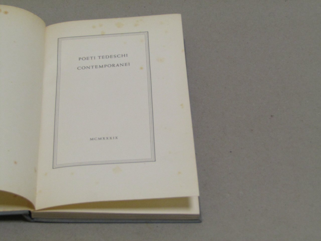 AA. VV. AA. VV. Poeti tedeschi contemporanei. Lipsia, Offizin Poeschel & Trepte 1939 - I italiano, in ottavo pp.96 Antologia pubblicata dalla Sezione per la letteratura del Ministero del Reich per la propaganda in occasione della mostra del libro tedesco a Roma. Pagine ingiallite e macchiate dal tempo. Copertina cartonata. Dorso e bordi della copertina ingialliti. Dorso lievemente strappato. Timbri sulla prima pagina.