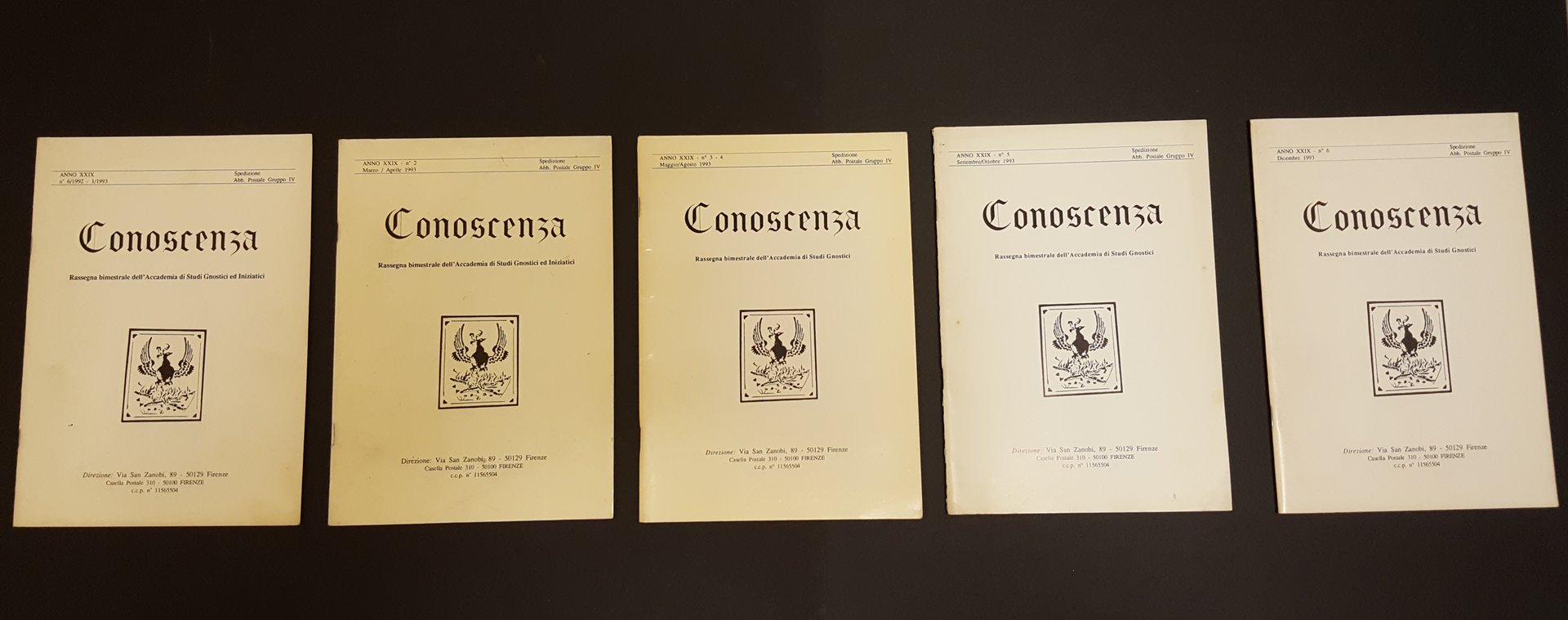 AA. VV. AA. VV. Rivista Conoscenza. Accademia di Studi Gnostici. 1993. n. 6/1992-1/1993-2-3/4-5-6 annata completa. Firenze, Accademia di Studi Gnostici 1993 italiano, in ottavo pp. 48+48+64+48+48 28934