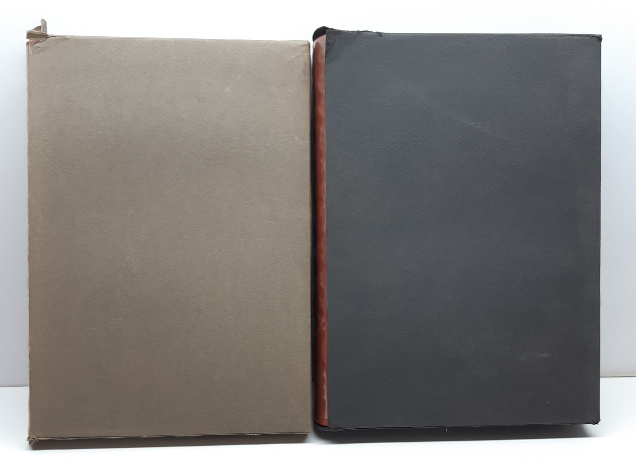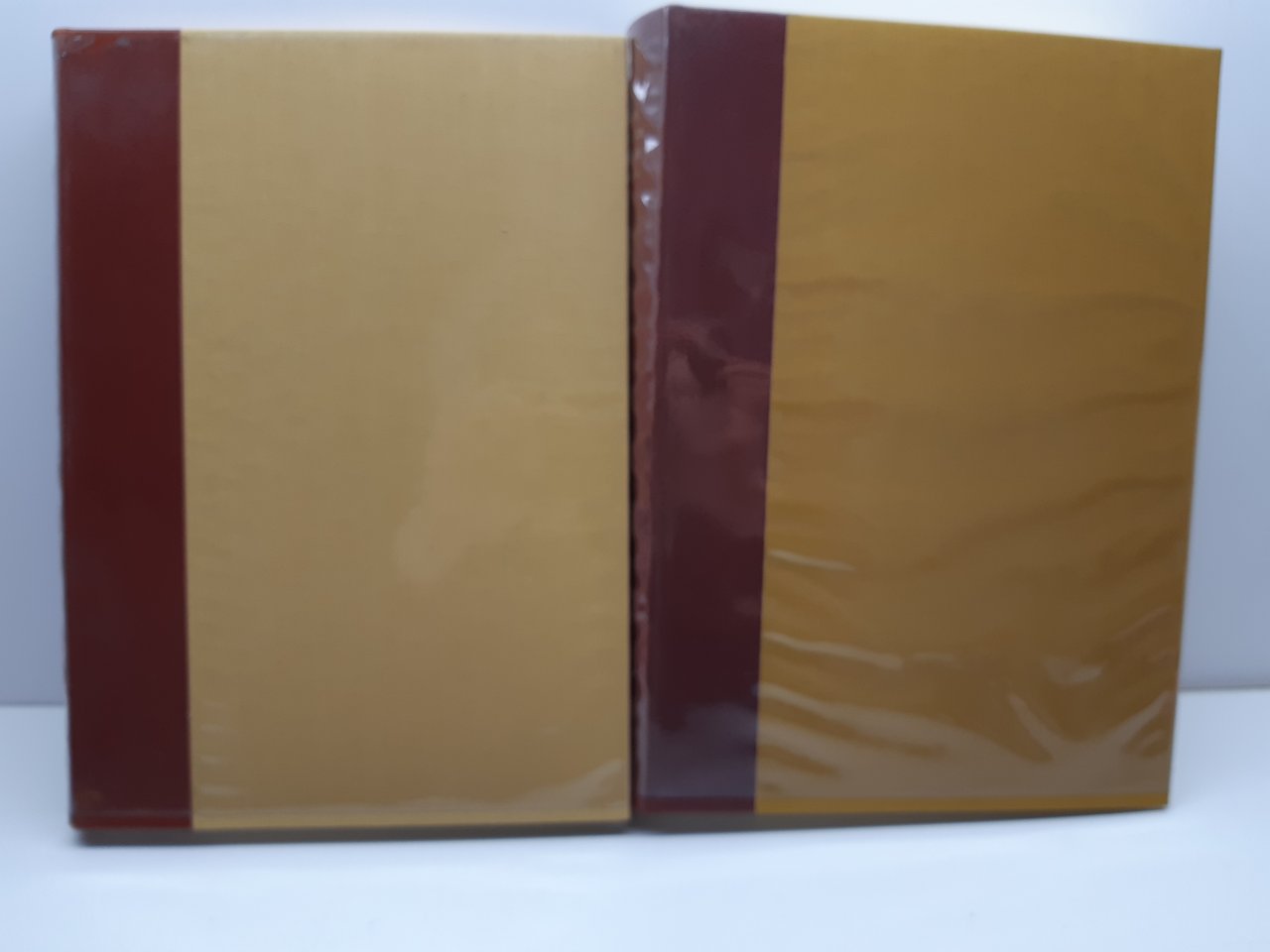 cofanetto in cartonato morbido in condizioni accettabili con rotture al margine superiore ed inferiore, sovraccoperta in acetato deformata al dorso e ai piatti, legatura in mezza pelle con piatti in tela color ocra, dorso in pelle marrone con titoli in oro, tagli superiori dorati, interno in buono stato, numero pagine 270 + fotografie + 485 dimensione di ciascun volume cm 29 x 21,5