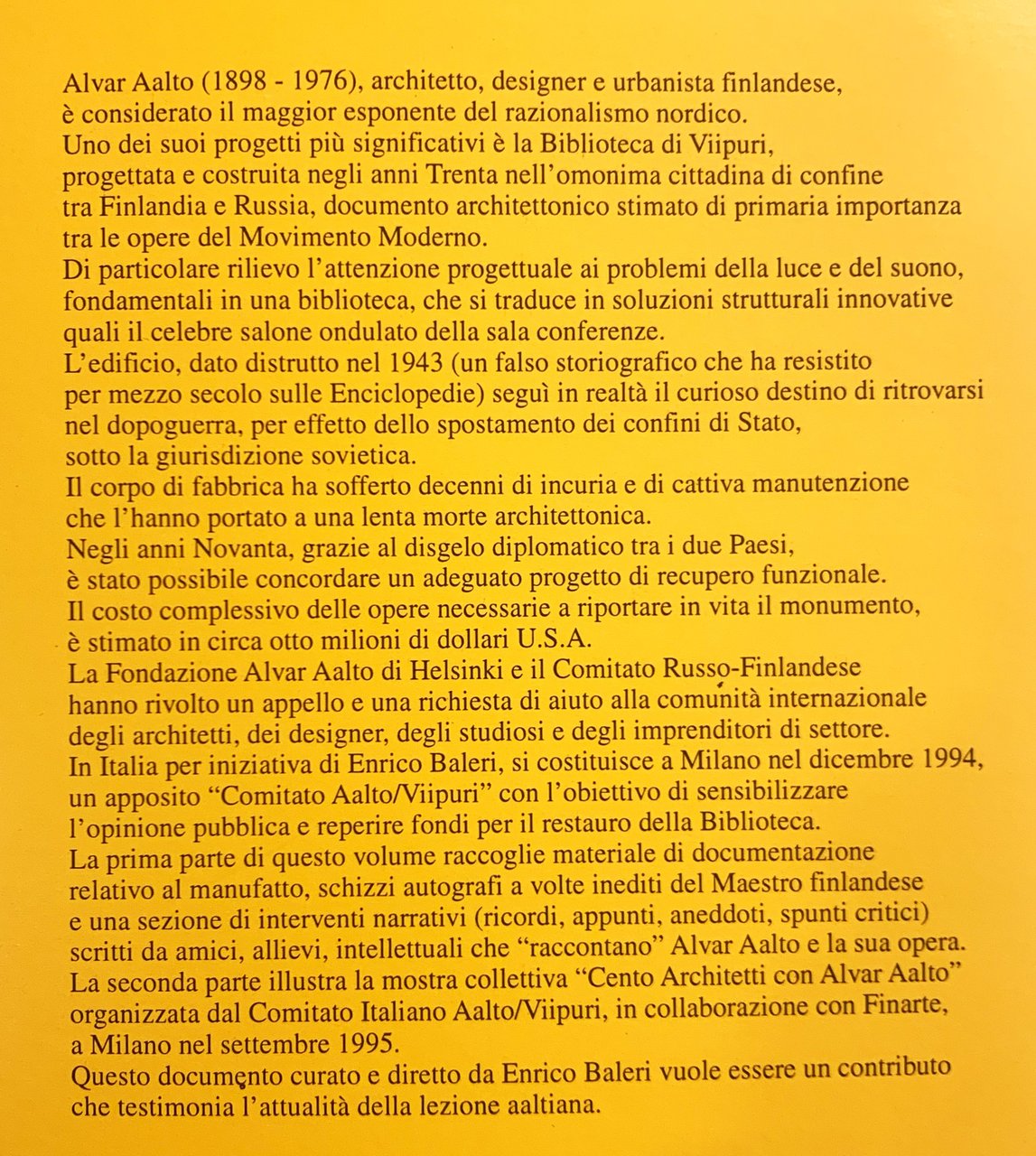 I ed., collezione "Abitare Segesta Cataloghi" (Editore: Renato Minetto - Direzione editoriale: Antonella Minetto). "Per salvare la Biblioteca di Viipuri: la cultura italiana con Alvar Aalto (dal primo piatto della sovracc.). "Il volume è stato pubblicato in occasione dell'asta delle opere "Cento Architetti con Alvar Aalto", organizzata da Finarte a Milano il 21 settembre 1995" (dal colophon). "Il corpo di fabbrica ha sofferto decenni di incuria e di cattiva manutenzione (. . .). / Negli anni Novanta (. . .) è stato possibile concordare un adeguato progetto di recupero funzionale. (. . .). La Fondazione Alvar Aalto di Helsinki e il Comitato Russo-Finlandese hanno rivolto un appello e una richiesta di aiuto alla comunità internazionale degli architetti, dei designer, degli studiosi e degli imprenditori di settore. / In Italia per iniziativa di Enrico Baleri, si costituisce a Milano nel 1994, un apposito comitato "Aalto/Viipuri (. . .). / La prima parte di questo volume raccoglie materiale di documentazione relativo al manufatti, schizzi autografi a volte inediti del Maestro finlandese e una sezione di interventi narrativi (ricordi, appunti, aneddoti, spunti critici) scritti da amici, allievi, intellettuali (. . .). / La seconda parte illustra la mostra collettiva "Cento Architetti con Alvar Aalto" organizzata dal Comitato Italiano Aalto/Viipuri, in collaborazione con Finarte, a Milano nel settembre 1995*" (dal primo risvolto della sovracc.). Comitato d'onore: Giancarlo De Carlo, Kristian Gullichsen, Letterio Mangano, Federico Marconi, Leonardo Mosso, Vezio Nava, Roberto Sambonet, Alberto Sartoris. In-4, pp. 160, brossura, sovraccoperta con grafica in giallo/nero/rosso (copertina di Roberto Sambonet con Laura Ruggeri). Illustrazioni a colori e in b/n (Progetto grafico e impaginazione: Laura Ruggeri - Riprese delle opere "Cento Architetti con Alvar Aalto": Fotoscientifica, Parma - Metis Informatica, Roma). Stato buono (leggero stato d'uso della sovraccoperta). Indice: Salviamo Viipuri!; Enrico Baleri - Il Comitato Italiano Aalto Viipuri - Sintesi tra intelligenza ed emozione; Kristian Gullichsen - Onore a Alvar Aalto; Giancarlo De Carlo - Aalto: Genio e umanità; Letterio Mangano - La Biblioteca di Viipuri; Federico Marconi - "O capitano, mio capitano"; Leonardo Mosso - Colpire con la sorpresa; Vezio Nava - Alvar Aalto appunti-indice; Roberto Sambonet - Omaggio all'architetto Alvar Aalto; Alberto Sartoris - La biblioteca di Viipuri e la biblioteca di Vyborg; Fabio Mangone - L'inizio dei lavori di restauro: la grande vetrata esterna; Vezio Nava - Fasi del processo di restauro della Biblioteca Municipale di Alvar Aalto a Viipuri. Il Comitato Finlandese per il restauro della Biblioteca di Viipuri - La mostra itinerante italiana della Biblioteca di Viipuri - Le pagine pubblicitarie del Comitato Italiano Aalto/Viipuri - Cento architetti con Alvar Aalto. La cultura italiana del progetto per salvare la Biblioteca di Viipuri.