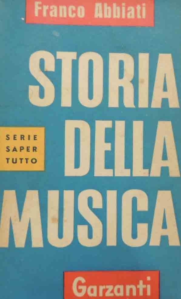 Franco Abbiati, Storia della musica, Garzanti, s.l. (ma stampato a Milano, presso le Officine Grafiche Aldo Garzanti) 1956, pp. 282, cm 19, br. ed. Collana Saper Tutto, nn. 45-46. Leggere tracce d’uso alla brossura, minime fioriture, lieve ingiallitura della carta, per il resto buona copia.