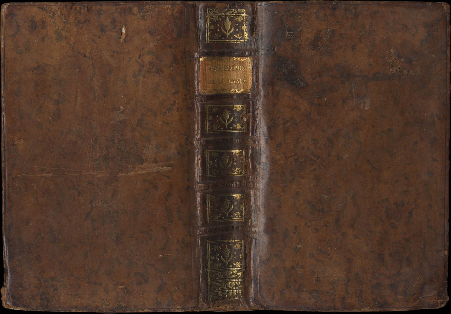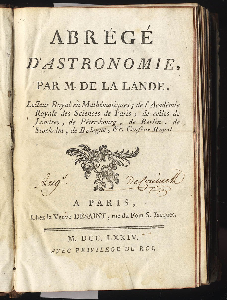 >in-8, pp. XXXVI, 507, (1), leg. coeva in p. pelle, fregi e tassello arancione al dorso a nervi (lievi lacune al dorso). Corredato di 16 belle tavole f.t. incise da De la Gardette, fregetto al tit., iniziali e testatine istoriate. Prima edizione dell'opera del De La Lande, volta ad un pubblico più ampio e con fini maggiormente didattici rispetto all'Astronomie, opera di maggior successo dell'autore. Precede l'opera una lunga prefazione dell'autore. Provenienza: al risguardo ant. ex libris dei librai V.e Le Jeune & Fils (tracce di gore d'acqua nel margine inf. dei primi e degli ultimi ff.). Houzeau-Lancaster II, 8908.
