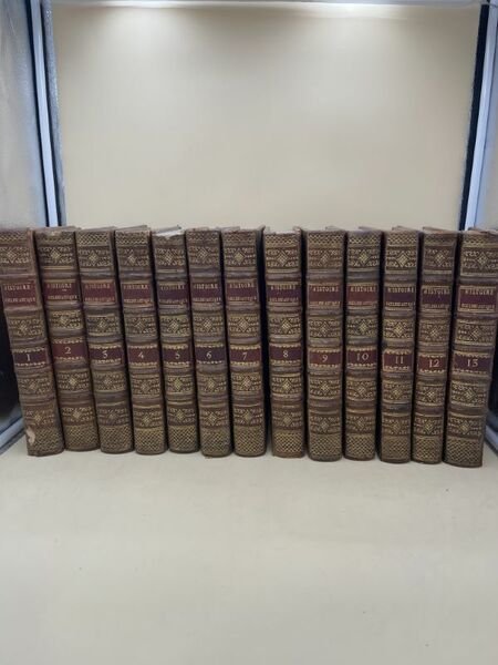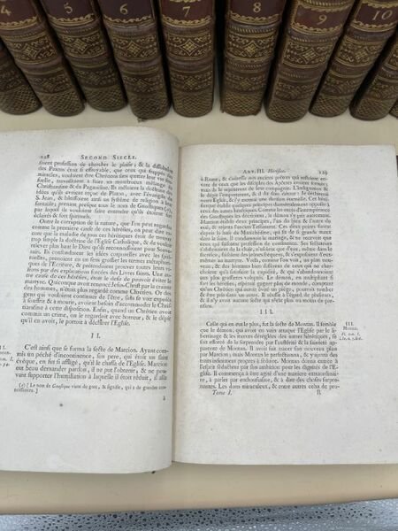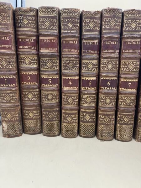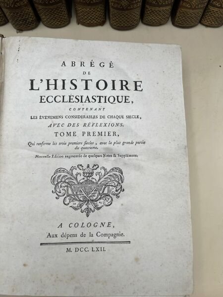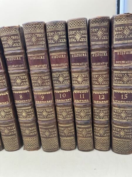 Aux Dépens de la Compagnie 1762 A Cologne, Aux Dépens de la Compagnie, 1762. 13 volumes In-4 plein veau de l'époque, dos à 5 nerfs soulignés très ornés, pièces de titre et de tomaison rouges. Reliés avec In-fine du tome XIII : (Père Bernard LAMBERT) Reflexions sur l'état actuel de l'église, 8 pages In-4 à la date de 1787, texte sur 2 colonnes (Cf. Barbier IV, 143 qui dit "B. Lambert les destinait à servir de discours préliminaire au Nouvelles ecclésiastiques pour 1787, des raisons ayant porté l'éditeur à ne pas les insérer, elles ont été imprimées à part, soit In-4, soit In-12". Clément IV "Bulles d'extinction de la société des Jésuites", Rome de l'Imprimerie de la Chambre Apostolique 1773, 32 pages In-4, texte sur deux colonnes. Suivent 13 pages blanches. BOSSUET Jacques Benigne BOSSUET, Evêque de Meaux, Conseiller du Roy en ses Conseils et Ordinaire en son Conseil d'Etat, ci devant Précepteur de Monseigneur Le Dauphin, premier Aumônier de Madame la Duchesse de Bourgogne "Justification des reflexions sur le nouveau testament" Impirmées de l'autorité de Monseigneur l'Evêque et Comte de Chalons et approuvées par Monseigneur le Cardinal de Noailles, Archevêque de Paris. Composée en 1699 contre le "Problème ecclésiastique". Lille chez Jean Baptiste Broviellio 1714, In-4, page de titre, un feuillet d'errata, avertissement, 48 pages, table des sections et table des matiéres. Importante mouillure allant en s'estompant sur l'ensemble des pages en partie gauche, néanmoins bon état. Edition originale de ce célébre texte de Bossuet (Cf. Brunet I, 1139). Très bel ensemble, très bien relié à l'époque. Les petits défauts que nous décrivons ci-dessous n'atteignent que fort peu cette somme sur le sujet fortement enrichie par les documents reliés avec décrits ci dessus. Cf : Brunet VI, 1135. N° 21373. Mention de nouvelle édition augmentée de quelques notes et suppléments par Laurent Etienne Rondet. Cf. Barbier I, 24. Tome I : QUI RENFERME LES TROIS PREMIERS SIECLES AVEC LA PLUS GRANDE PARTIE DU QUATRIEME. XXXII + 585 pages. Une déchirure à la derniére page sans perte de papier. Un manque de cuir en bas du dos. Tome II : QUI RENFERME UNE PARTIE DU QUATRIEME SIECLE AVEC LE CINQUIEME ET LE SIXIEME. XLVI + 664 pages.Forte mouillure marginale en partie supérieure d'un tiers du volume avec pour une trentaine de pages une importante galerie de vers marginale sans perte de texte, quelques unes restaurées anciennement. Tome III : QUI RENFERME LE VII°, VIII° ET IX° SIECLE. XXXII + 571 pages. Tome IV : QUI RENFERME LE X°, XI° ET UNE PARTIE DU XII° SIECLE. XXIII + 518 pages. Un manque de cuir en partie supérieure du mors du 2° plat. Tome V : QUI RENFERME UNE PARTIE DU XII° SIECLE AVEC LA PLUS GRANDE PARTIE DU XIII° SIECLE. XXXIV + 522 pages. Petit manque de cuir à la coiffe sans gravité. Tome VI : QUI RENFERME LE XIII° SIECLE AVEC LE XIV° SIECLE. XXIII + 520 pages. petit manque de cuir au 2° plat sans gravité. Tome VII : QUI RENFERME LE XV° SIECLE. XXVII + 579 pages. Galerie de vers en marge sans perte de texte des 40 derniéres pages. Petit manque de cuir sur le 2° plat sans gravité. Tome VIII : QUI RENFERME LES DOUZE PREMIERS ARTICLES DU XVI° SIECLE. XXXVIII + 572 pages. Petit manque de cuir en partie supérieure du 2° plat et une restauration ancienne. Tome IX : QUI RENFERME LES 14 DERNIERS ARTICLES DU XVI° SIECLE. VIII + 598 pages. Tome X : QUI RENFERME LES NEUFS PREMIERS ARTICLES DU XVII° SIECLE. LVI + 483 pages; Tome XI : QUI RENFERME DIX ARTICLES DU XVII° SIECLE. VIII + 455 pages. Galerie de vers marginale sans perte de texte aux 60 derniéres pages. Tome XII : QUI RENFERME 11 ARTICLES DU XVII° SIECLE. VII + 518 pages. Tome XIII : QUI RENFERME LES 10 DERNIERS ARTICLES DU XVII° SIECLE. VI + XX +524 pages. Chaque volume commence par une table chronologique très détaillée du plus grand intérêt tant pour la compréhension des événements relatés que pour l'histoire en général. Le tome XIII contient un abrégé de la vie de Bonaventure RACINE, prêtre, chanoine de la Cité d'AUXERRE (Yonne), né en 1708 à CHAUNY, diocése de NOYON. Il fut également Principal du Collége de RABASTENS (Tarn). Janseniste convaincu.