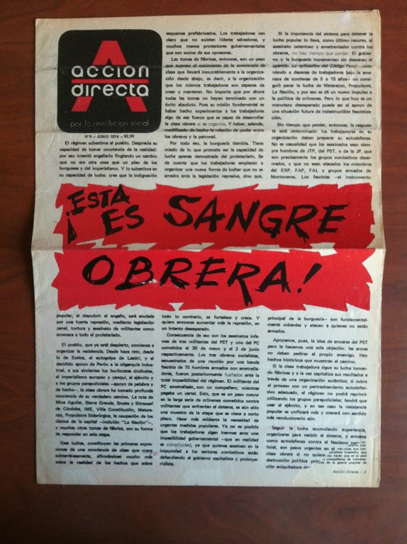 ACCION DIRECTAPOR LA REVOLUCION SOCIALNro 8 Junio de 19748 pagineDirettore L. Akratoin buone condizioni salvo angolo prima pagina basso destra mancante come da foto (25 g) E19726