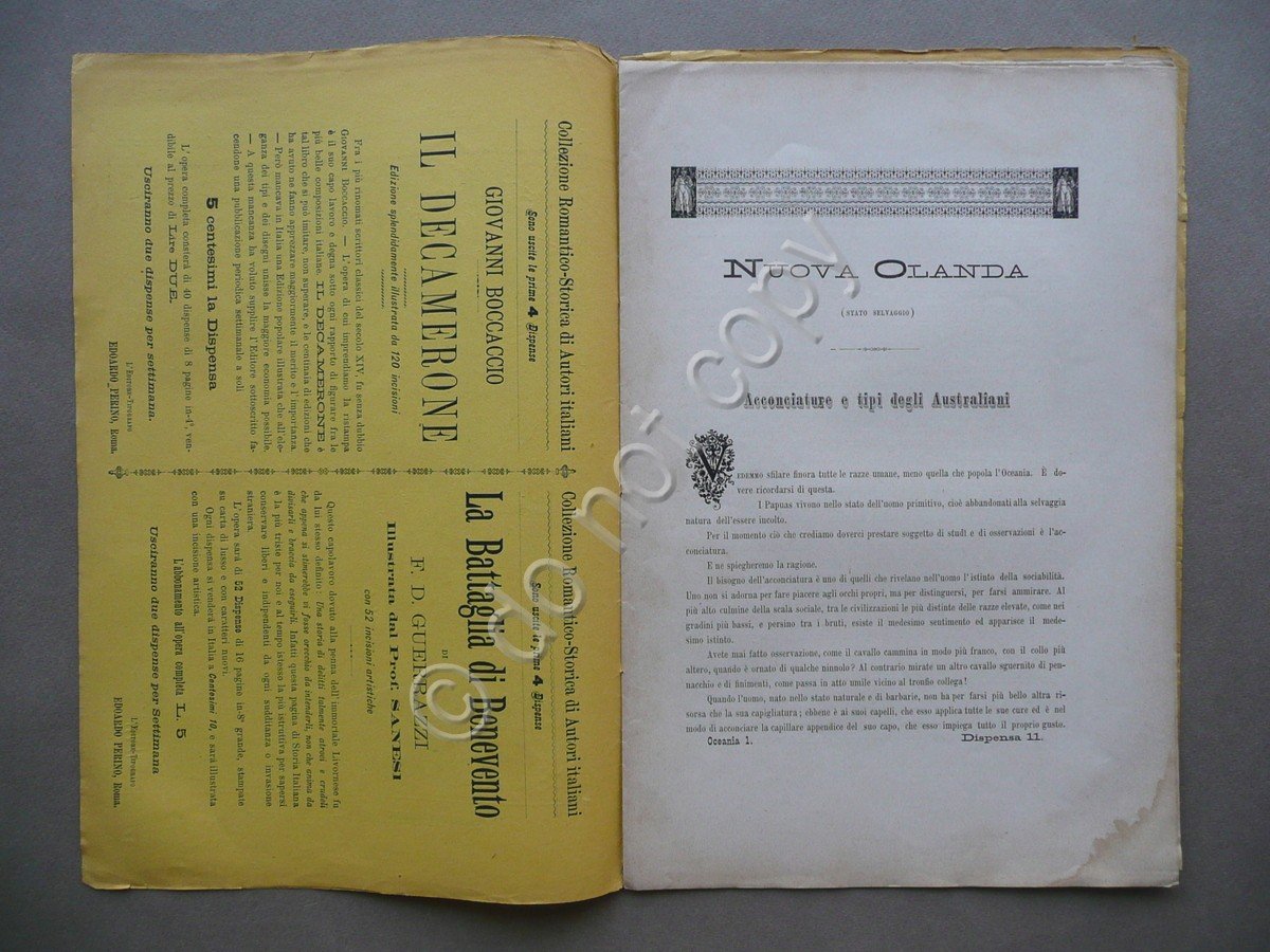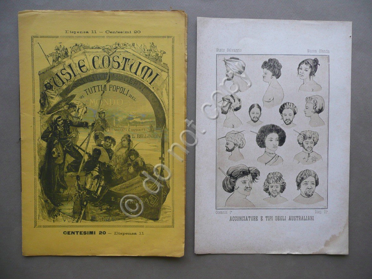 L. Bellinzoni, Nuova Olanda (Stato selvaggio) - Acconciature e tipi degli Australiani in Usi e costumi antichi e moderni di tutti i popoli del mondo" narrati e descritti da L. Bellinzoni Dispensa 11 E. Perino Editore, Roma, s.d. (fine '800 circa), cm 30x20, pp. 8 con acclusa una tavola a col. (vedi foto), brossura ed. ill. in b/n. Condizioni di conservazione Esemplare in buone condizioni con tracce d'uso, brossure con alcuni piccoli strappetti, pieghette e poche piccolissime mancanze ai margini e agli angoli. Interni buoni, angoli inferiori delle pagine e della tavola a col. con lieve ombra di gora che non interessa il testo o le illustrazioni, margine sup. di alcune pagine con piccoli difetti causati dall'apertura maldestra di esemplare intonso. SC03.D9340 N "