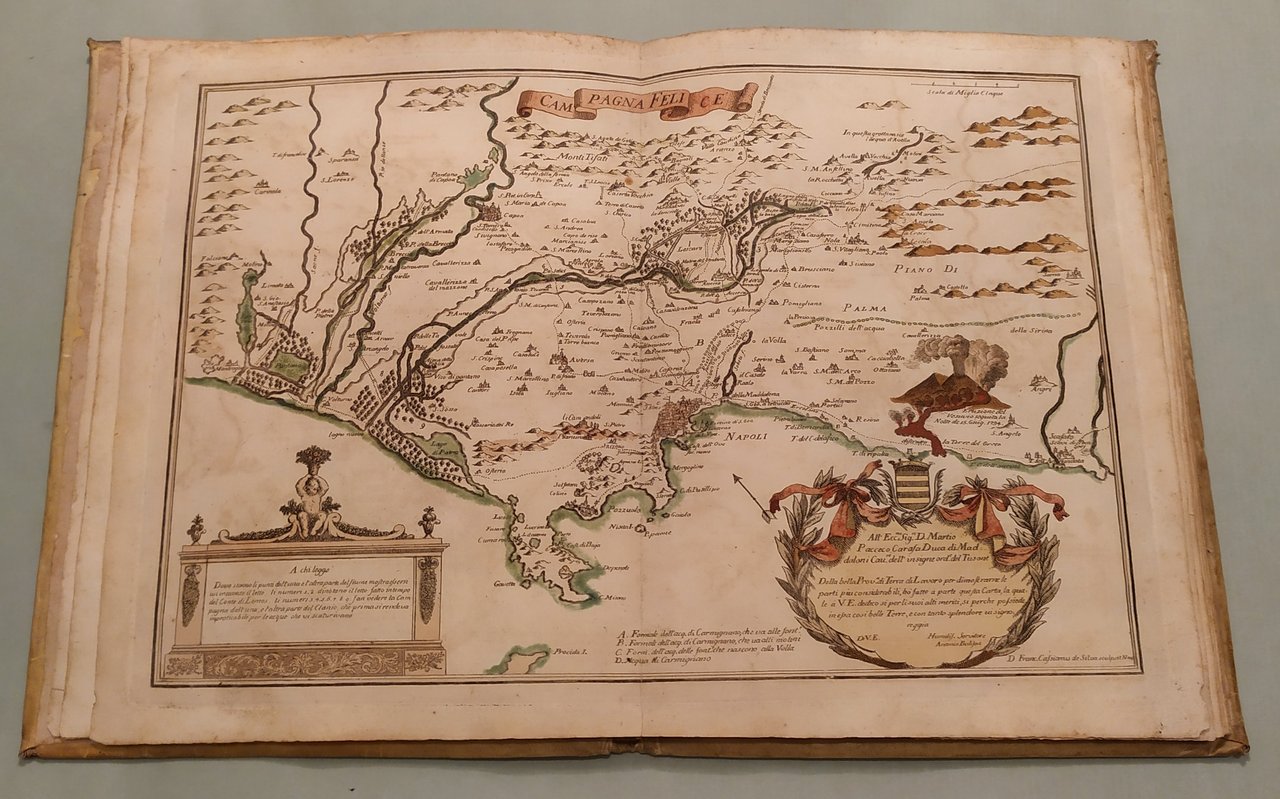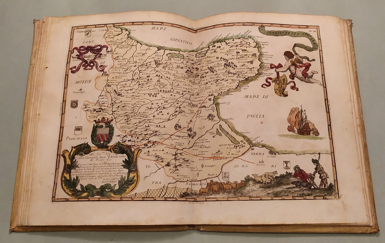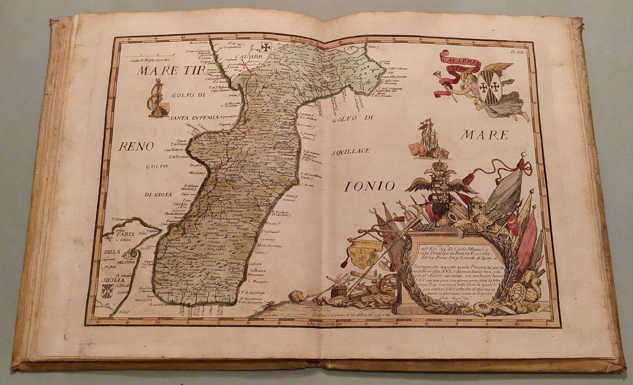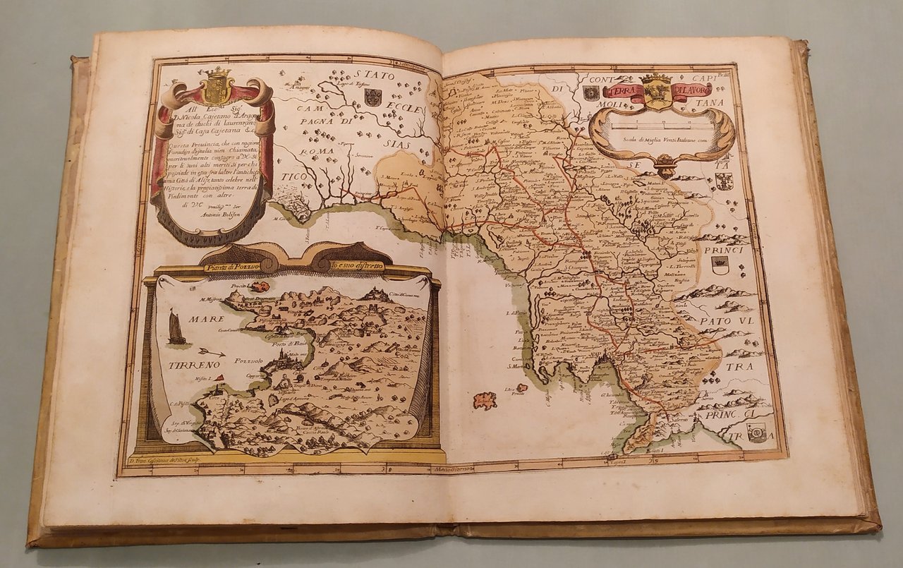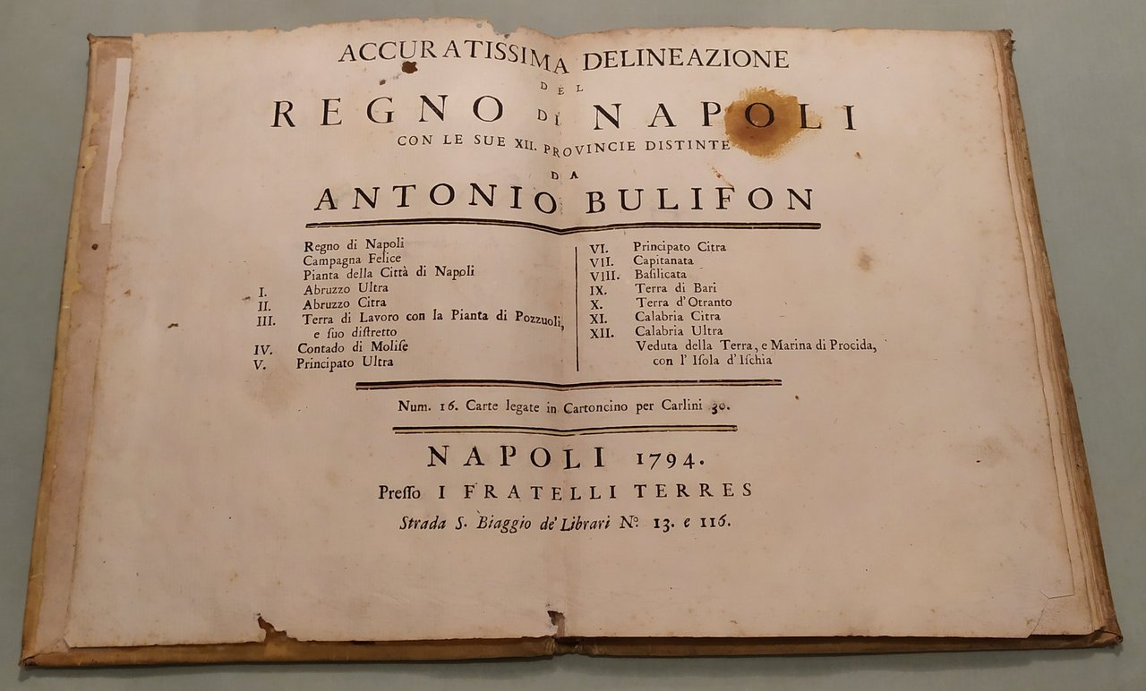 Napoli, fratelli Terres, 1794. In 4to (cm.25x19). Frontespizio e 16 tavole a doppia pagina con splendida coloritura coeva. Le quindici carte geografiche opera di Francesco Cassiano da Silva. La tavola della città di Napoli di Giuseppe Aloja. Ricchi cartigli e decorazioni su ciascuna tavola. In fine una tavola spieghevole in bianco e nero della Terra di Lavoro. Pergamena coeva marmorizzata, piatti inquadrati da ricchi fregi in oro, insegne floreali dorate. Pironti, Editori Francesi a Napoli, pag.109 per le precedenti edizioni del 1692, 1714 e 1734; Phillips, Atlases 3067. Raro.