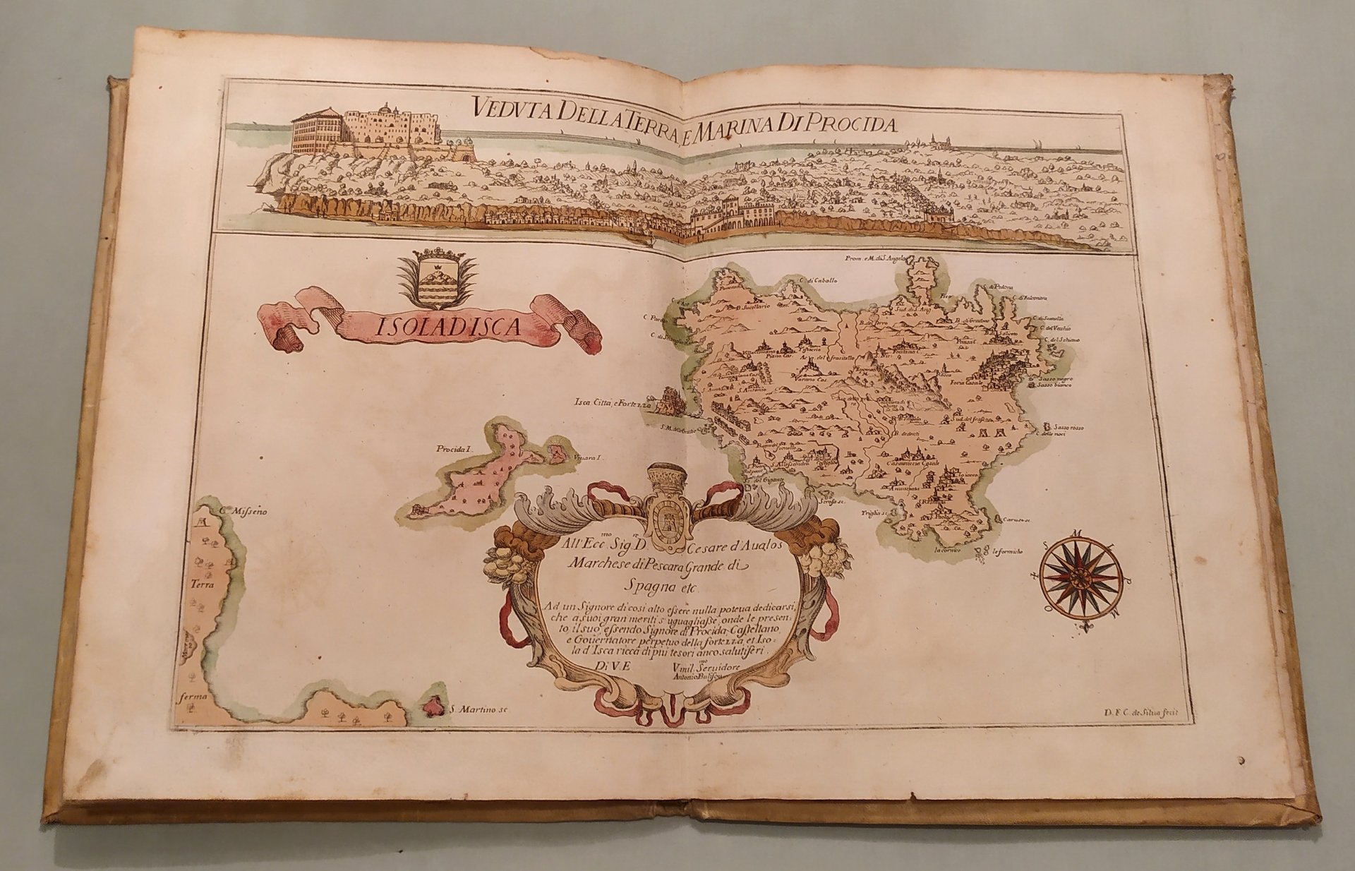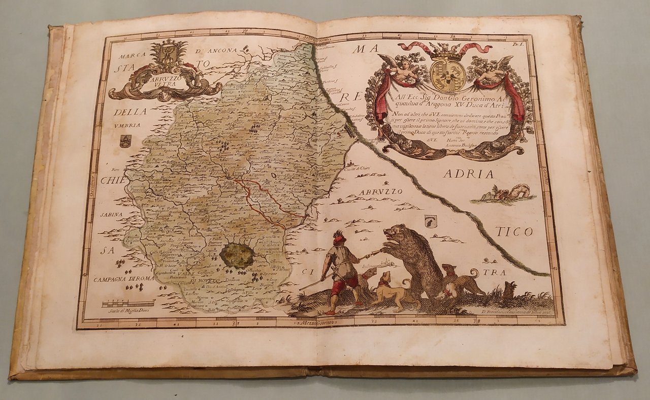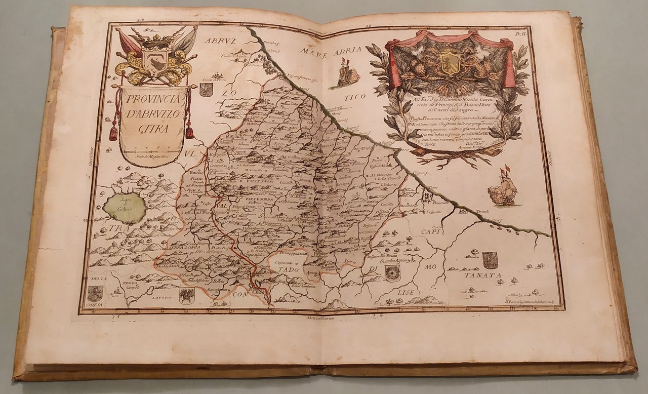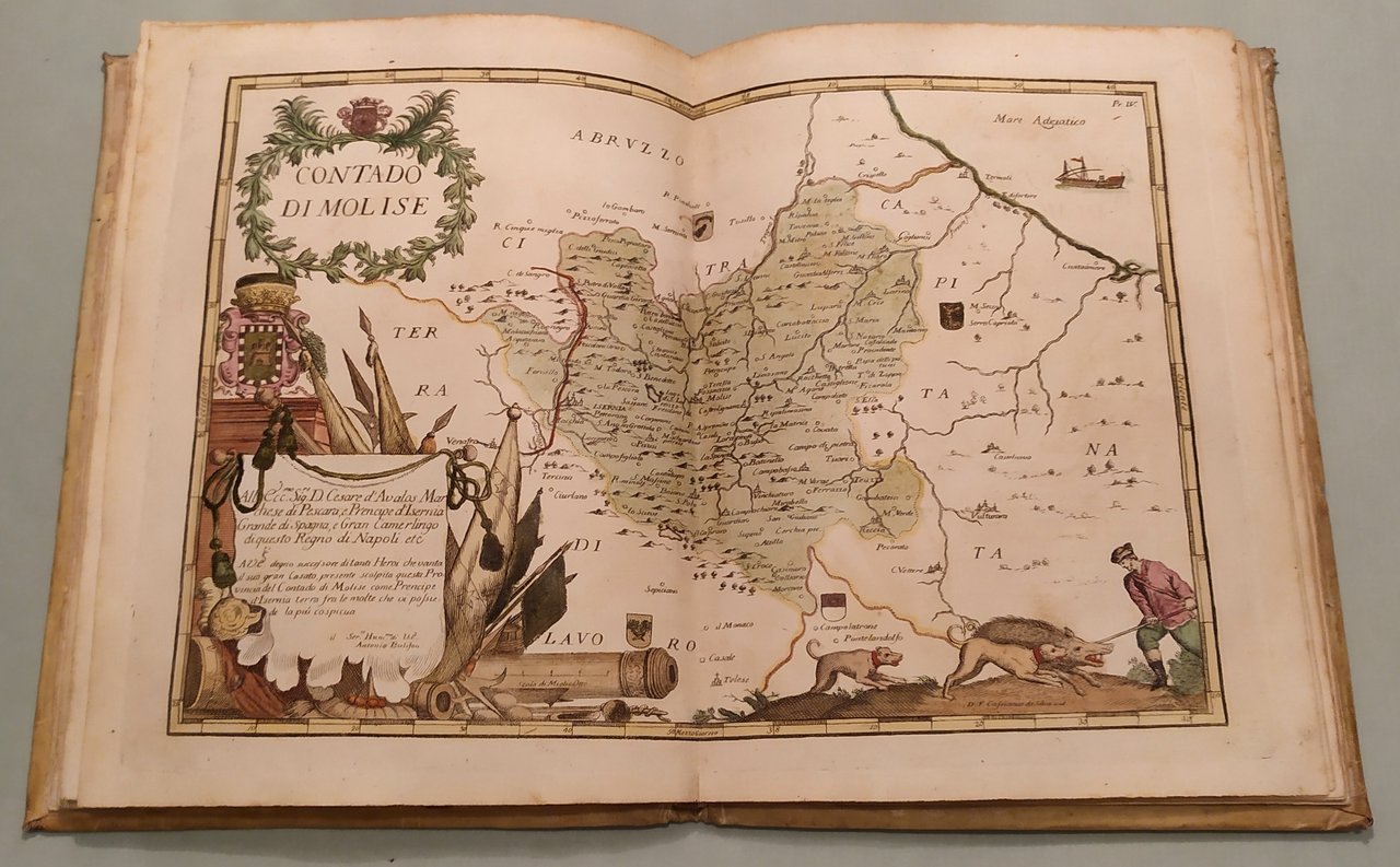 Napoli, fratelli Terres, 1794. In 4to (cm.25x19). Frontespizio e 16 tavole a doppia pagina con splendida coloritura coeva. Le quindici carte geografiche opera di Francesco Cassiano da Silva. La tavola della città di Napoli di Giuseppe Aloja. Ricchi cartigli e decorazioni su ciascuna tavola. In fine una tavola spieghevole in bianco e nero della Terra di Lavoro. Pergamena coeva marmorizzata, piatti inquadrati da ricchi fregi in oro, insegne floreali dorate. Pironti, Editori Francesi a Napoli, pag.109 per le precedenti edizioni del 1692, 1714 e 1734; Phillips, Atlases 3067. Raro.