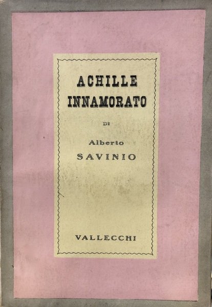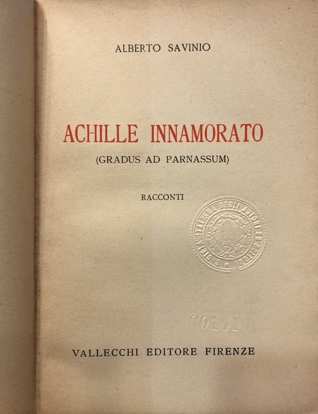 Prima edizione, 1938. Comprende la versione di Achille ƒnamourŽ M�lŽ ˆ l'Everg�te, pubblicato in SurrŽealisme au Service de la RŽvolution, n. 5, 1933. Brossura con sovracopertina (lievi segni sul dorso), pp 266. Collana Prosatori italiani contemporanei. Racconti