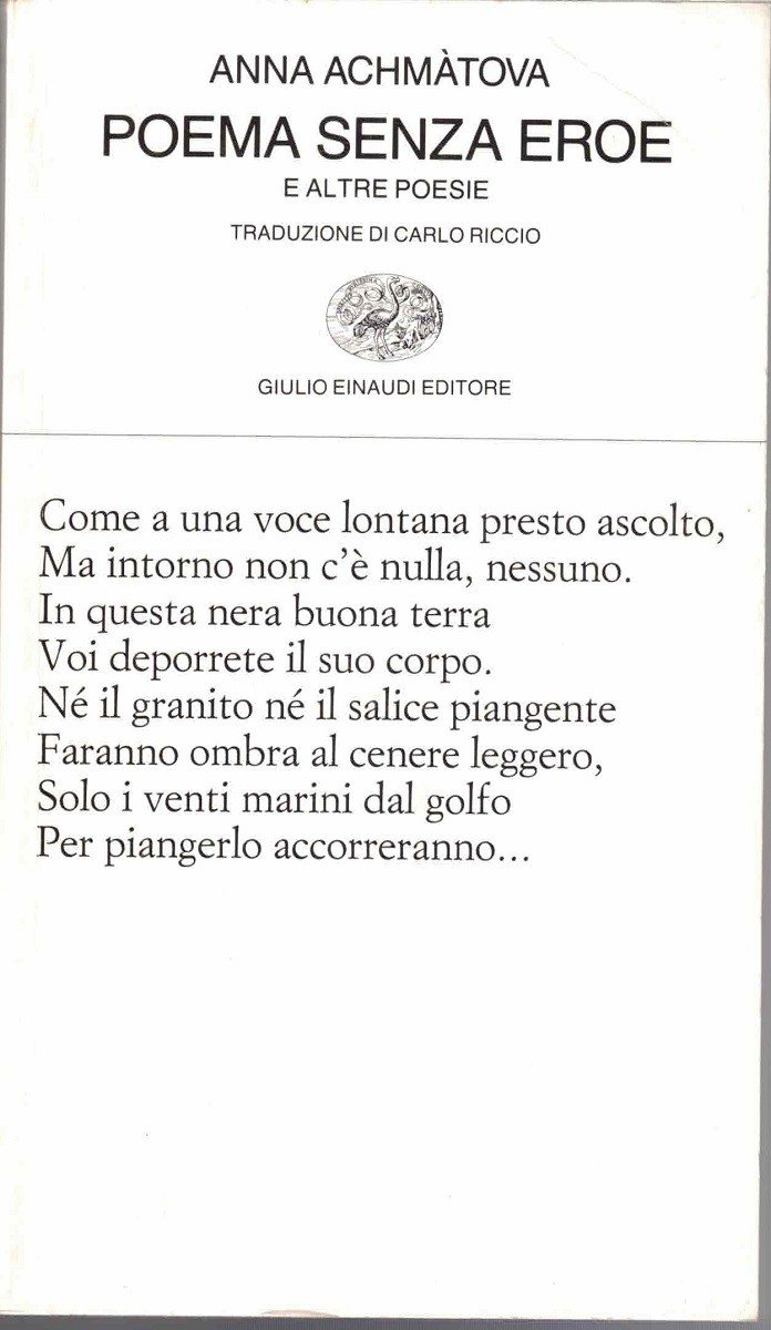 Anna Achmàtova, Poema senza eroe e altre poesie, prefazione e traduzione di Carlo Riccio, Giulio Einaudi editore, Torino s.d. (ma 1995?), pp. 180, cm 18, br. ed. Collana Collezione di poesia, vol. 33. Lievi tracce d’uso, minima ingiallitura della carta, per il resto molto ben conservato.