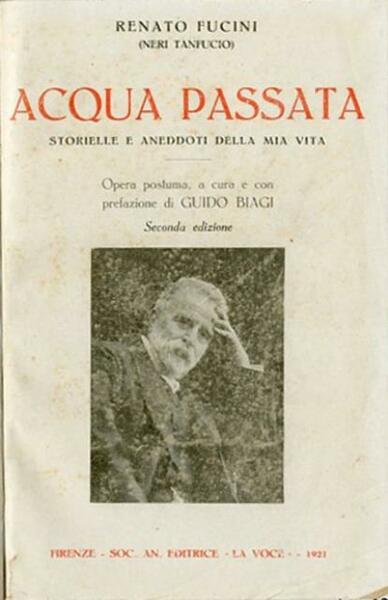 2. ed. XIII, 302 p. ; 20 x 14 cm. Opera postuma, a cura e con prefazione di Guido Biagi. In questi ricordi Neri Tantucio, pseudonimo di Renato Fucini, ritrae figure e scene del contado toscano con piglio rapido, schietto, e con un'arguzia che, se sbocca spesso nel comico, non esclude i toni seri o tristi. Queste storielle sono l'espressione meglio adeguata all'immaginario del suo piccolo mondo familiare e campagnolo, popolato più di tipi o macchiette che di caratteri, e al suo gusto del vagabondare per terre e paesi, del conversare alla buona e del raccontare a braccio. Legatura in cartoncino rigido, piatto della coperta muto, tassello al dorso col titolo mancante. Carta interna e tagli leggermente brunita, per il resto esemplare integro. Si conserva all'interno copia della coperta originale con titolo impresso in rosso e fotografia dell'autore. Firma di appartenenza nel frontespizio e nell'occhietto. Codice libreria 7808.