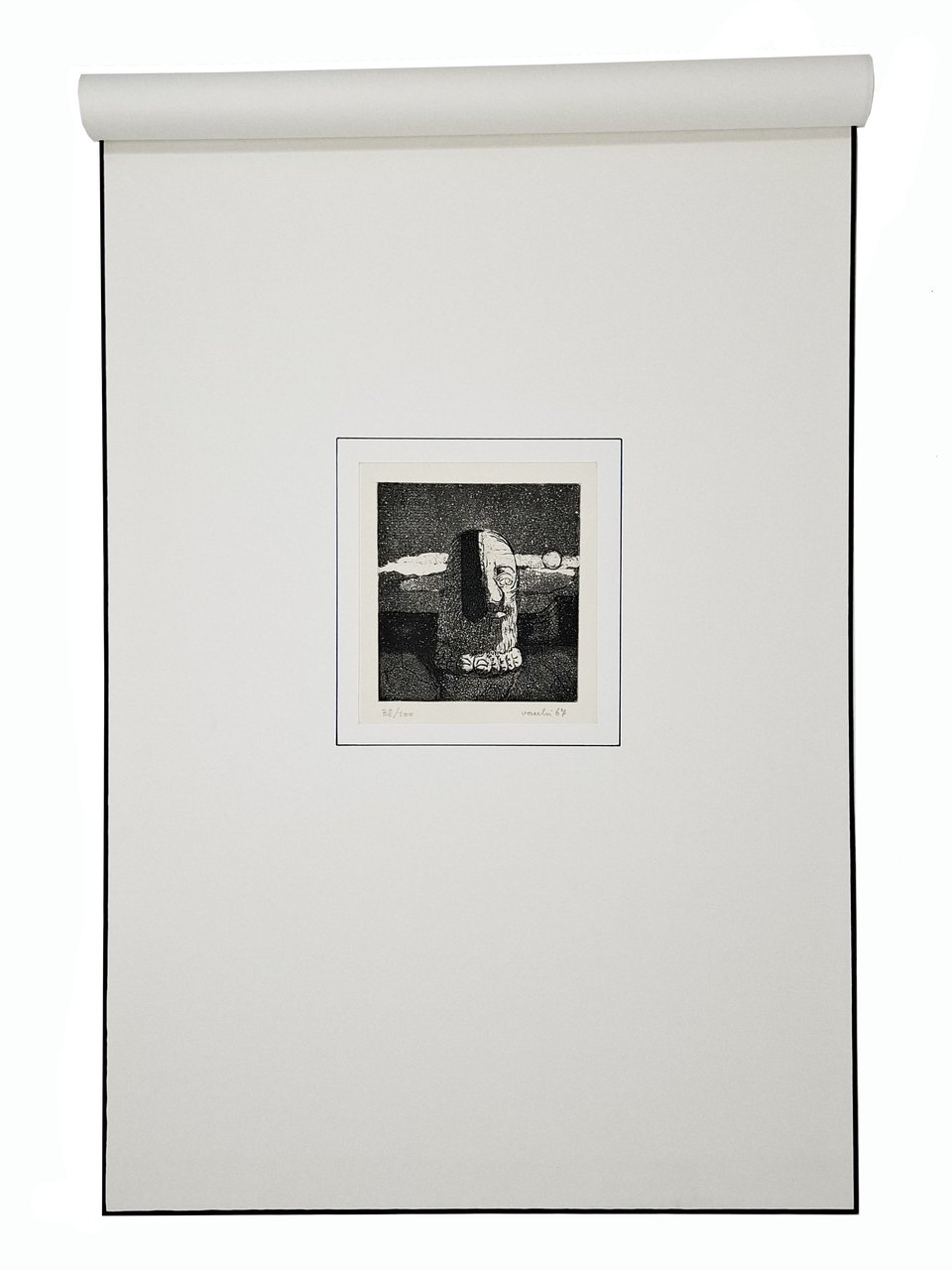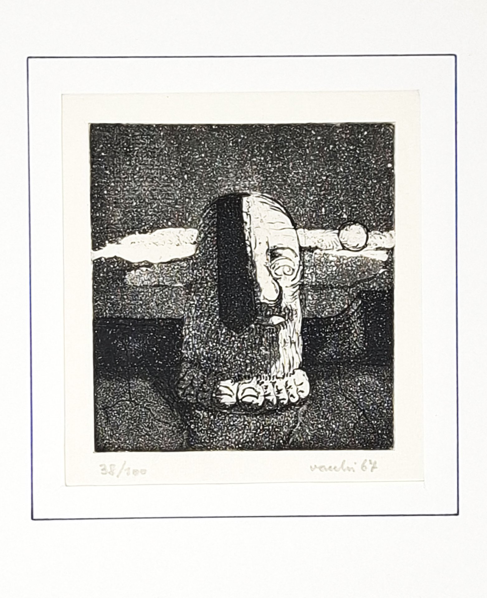 Acquaforte acquatinta numerata a matita (38/100), firmata e datata 'Vacchi 67'. Incisione elegantemente fissata all'interno di un passepartout, protetto da un foglio in carta velina. Fissata sul margine superiore del passepartout. Sul foglio di protezione è indicato, a penna, il nome dell'artista e la tecnica utlizzata. Formato dell'incisione visibile dal suo apposito riquadro ritagliato nel passepartout: 11 x 12 cm circa. Dimensione della battuta: 9 x 10 cm circa. Dimensioni del passepartout: 34 x 49 cm circa. Stato di conservazione: ottimo. Sergio Vacchi (Castenaso, 1º aprile 1925 - Siena, 15 gennaio 2016) è stato un pittore italiano, maestro dell'Informale e «una delle voci più significative della generazione degli anni venti[1]» del Novecento [wikipedia]. Splendida litografia numerata e firmata dall'artista, stampata con tecniche di alta qualità, perfetta per dare un tocco di eleganza e prestigio ad un ambiente o come regalo esclusivo per un appassionato d'arte.