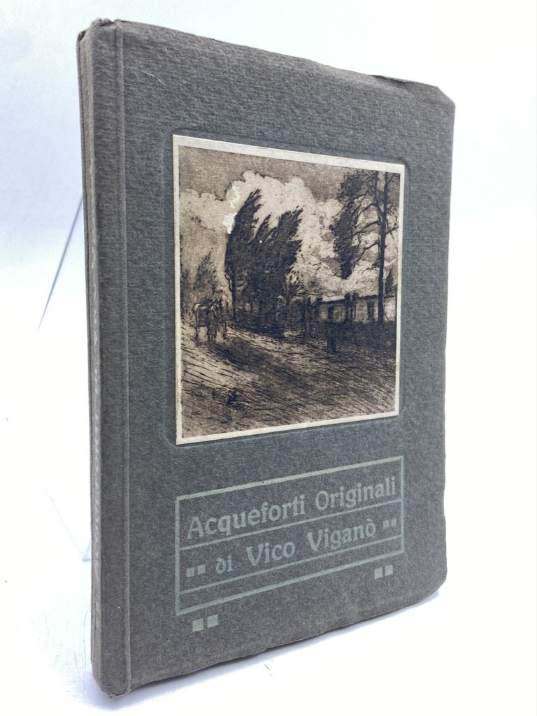 Brossura editoriale con titoli a stampa e illustrazione applicata (piccola abrasione), cm 17 x 12.5, pp XXIV + 44 tavole protette da velina, in parte doppie e ripiegate. Leggermente allentata la legatura. Elegante volumetto che presenta la produzione all’acquaforte del pittore Vico Viganò (Cernusco sul Naviglio 1874 - 1967), diplomatosi a Brera nel 1896 e affermatosi in questa tecnica incisoria attorno alla fine del secolo XIX. Dopo una fase iniziale prevalentemente caratterizzata dall'interpretazione di dipinti di Tranquillo Cremona, l'artista si dedicò ad una produzione originale ispirata a scene di vita rurale e vedute del Verbano. Il libro, prefatto dallo storico dell’arte Luca Beltarami, fu pubblicato nel 1910 dall’Associazione Italiana Acquafortisti e Incisori, fondata quello stesso anno dal Viganò: in calce al volume presentazione dell'Associazione, regolamento e elenco degli aderenti (tra questi, Luigi Conconi). Questo esemplare è impreziosito da un invio autografo dell'incisore, datato 1928.