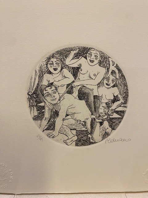 Particolare legatura/cofanetto in radica e titolo in oro, all'interno della cartella 12 fogli sciolti con 5 acqueforti di soggetto erotico, incise in ovale e protette da velina. Le cinque acqueforti, firmate e numerate, sono commentate da un breve testo di Ugo Moretti. La cartella è edita a Roma da "Il Nardo" nel 1984 e stampata su carta pescia dalla "Stamperia dell'Origano" in 120 esemplari più dieci prove d'autore, nostra copia 67. Sc. E.