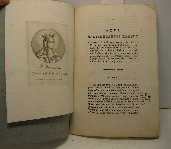 In 8, pp. 9 + (2b) con una tav. all'antip. inc. all'acq. raff. Ildegarda. Br. muta coeva. Vita della beata Ildegarda.